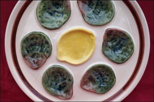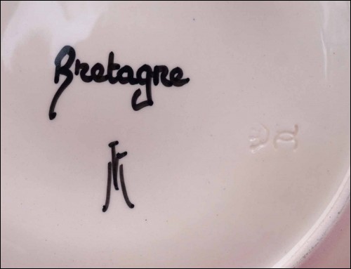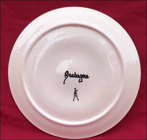 Assiette à huîtres d'artiste à six compartiments en relief pour les coquillages et un central pour la citron de la manufacture de Niderviller vers 1970. Modèle Bretagne peinte à la main et signée MV sur un fond. Très bel l'état. Diamètre 25,5 cm.