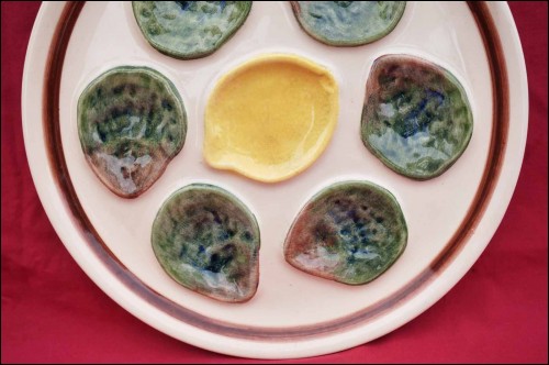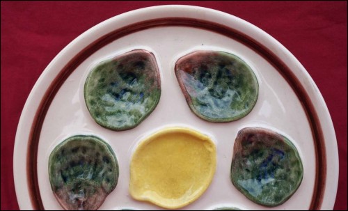 Vintage oyster plate with 6 shell compartments and one centrale for the lemon Bretagne pattern in french faience made by Nideviller during the 1970's. It's hand painted and signed on the back.10 1/8" (25.5cm) diameter. Perfect condition as shown by the following pictures.