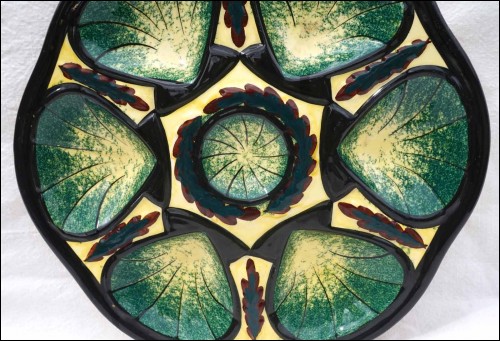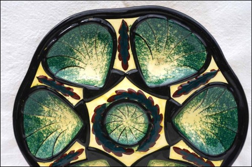 French hand painted faience oyster plate made by St Jean de Bretagne near Quimper during the 1960's. It's shapped with 6 shell compartments and one for the lemon or the butter. It has great colors of enamel on a cream background.10 5/8" (27cm) diameter. It's signed on the back. Perfect condition with a hole for hanging on the back as shown by the following pictures.