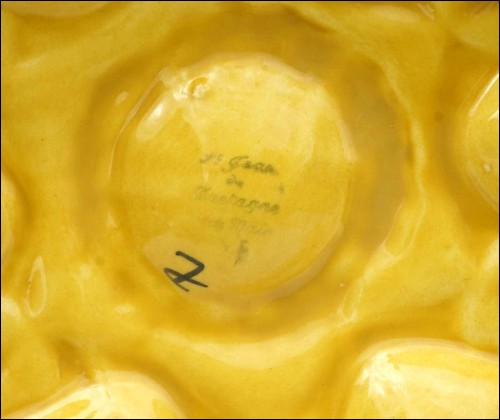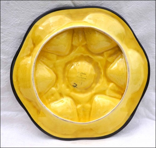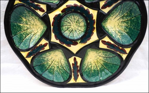 Assiette à huître à six compartiments pour les coquillages et un central pour le citron, de la célèbre manufacture de Saint Jean de Bretagne, près de Quimper, vers 1960. Signée au dos avec un trou pour l'accrochage. Elle est en bon état. Diamètre 27 cm.