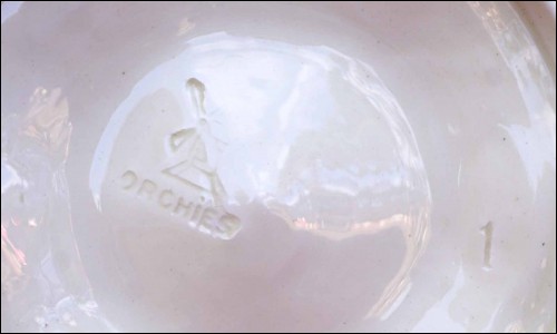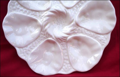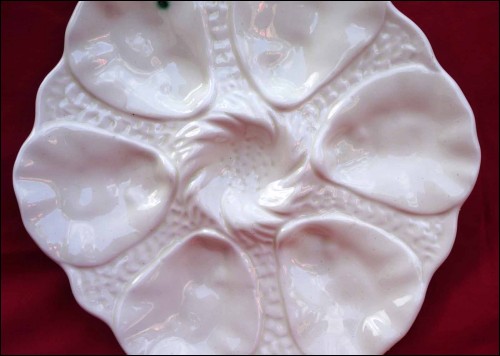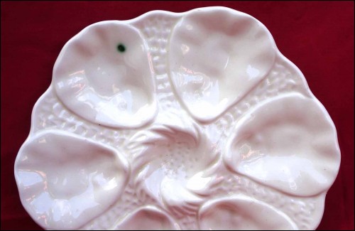 French white faience 6 well and one central shaped oyster plate made by Orchies during the 1900's. It's signed on the back. 9 3/4" (24.7cm) diameter. Good condition an enamel green stain in front as shown by the following pictures.
