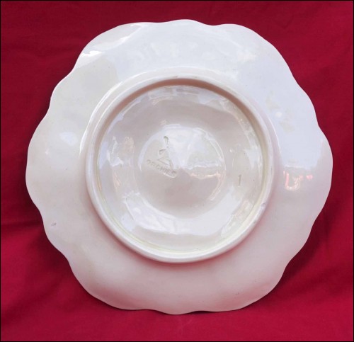 Assiette pour le service des huîtres d'Orchies, vers 1870. Elle est à six compartiment pour les coquillages et un central pour le citron. Bel état, une goutte d'émail vert en façade. Diamètre 25 cm. Signée au dos.