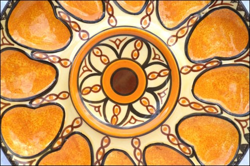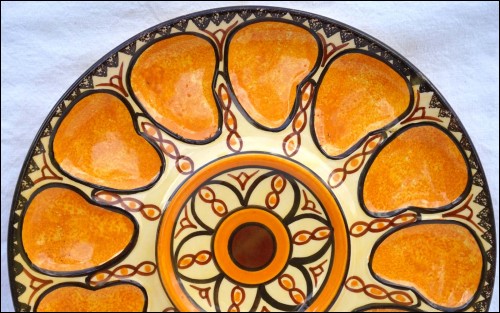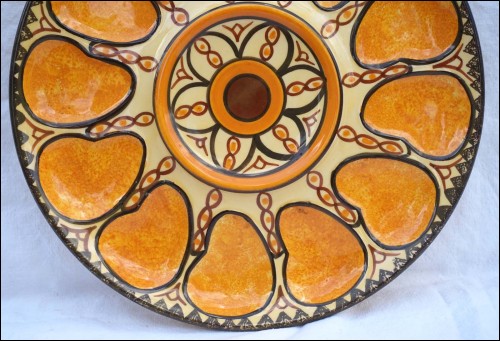 Plat à huître en faience, de la manufacture HB de Quimper, vers 1960. Il est à douze compartiments pour les coquillages et un central pour le citron. Parfait état. Il est signé sur son fond. Diamètre 33.7 cm.