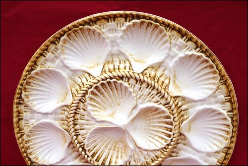 French faience oyster platter server dish with 12 shell wells on green basketweave ground made by Longchamp during the 1940's. It's signed on the back. 13 1/4" (33.5cm) diameter. Good condition as shown by the following pictures.