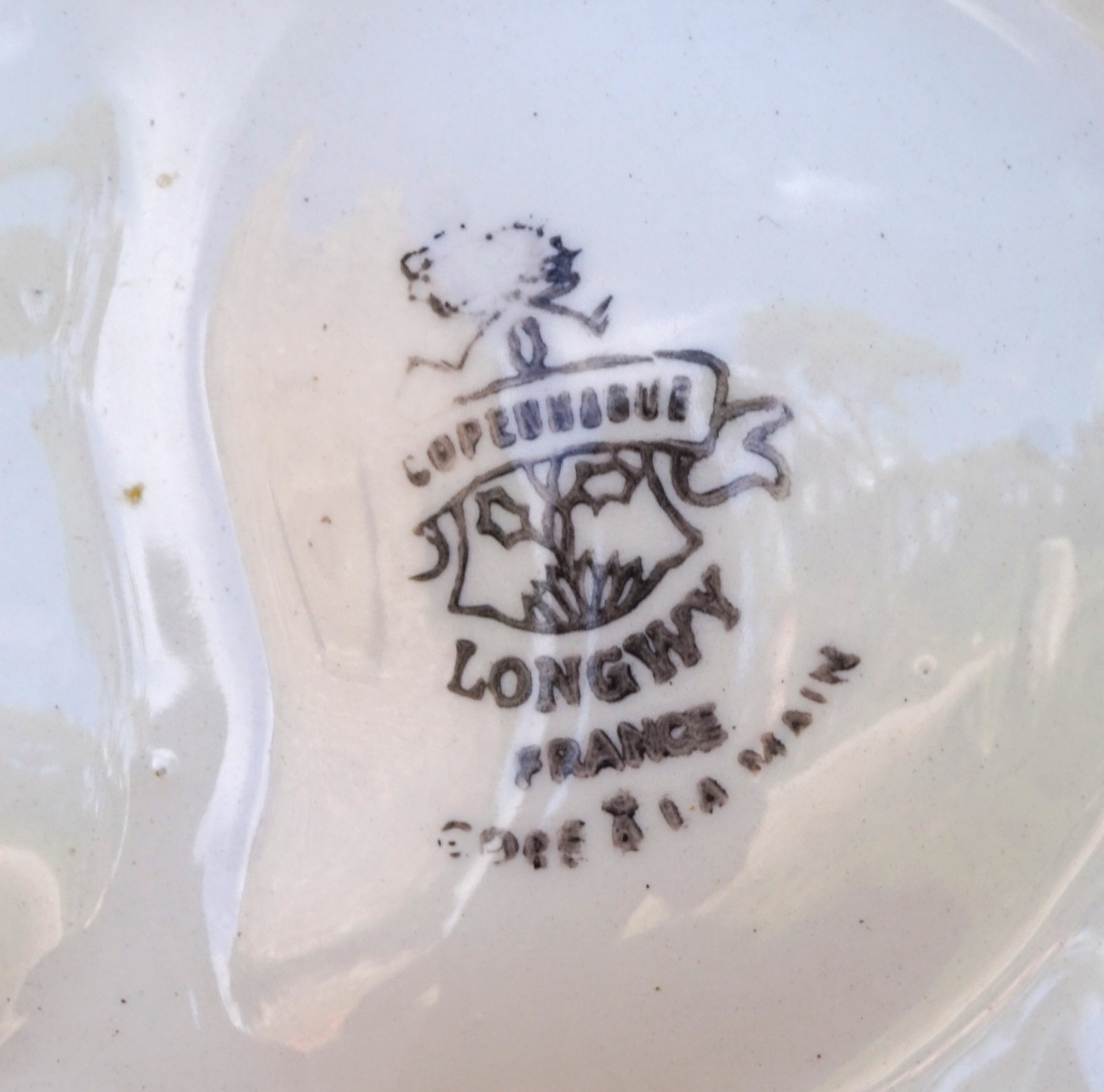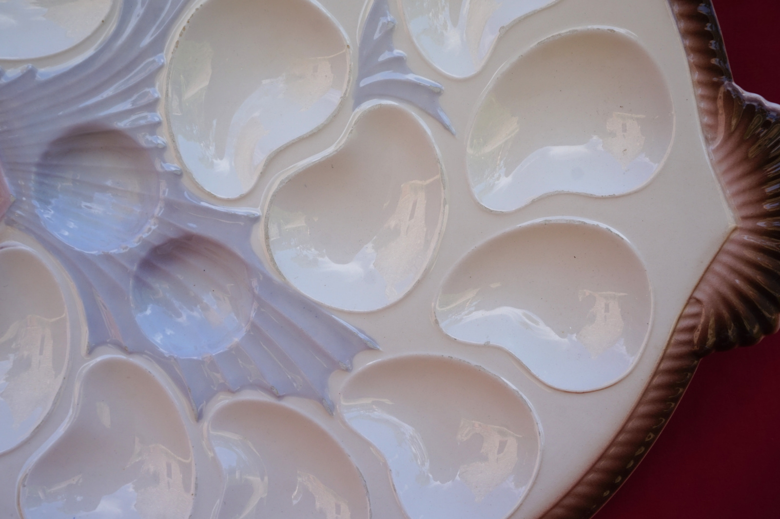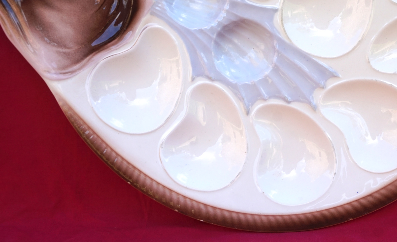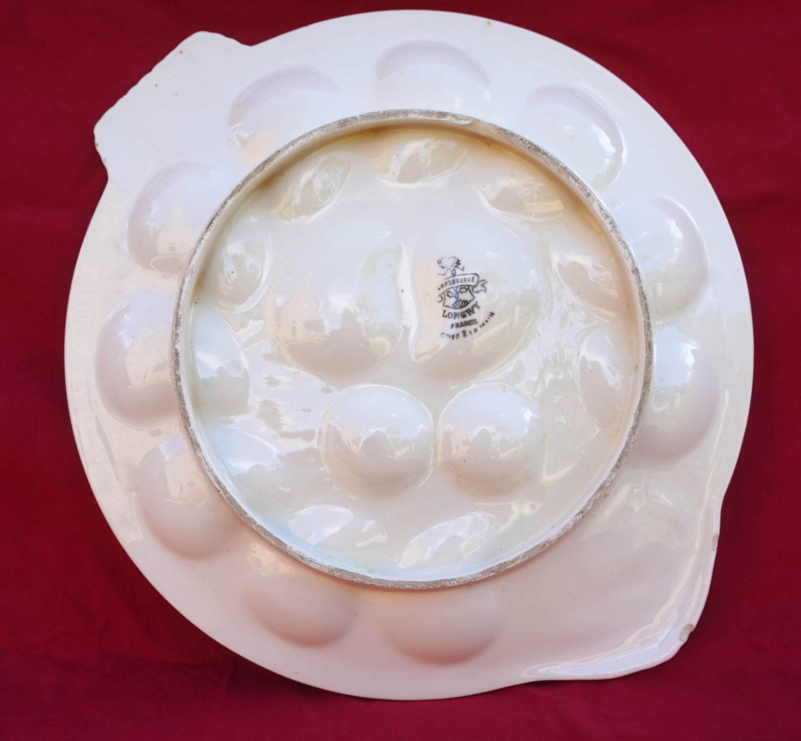 Grand plat de service pour les huitres en forme de poisson décor Copenhague par Longwy vers 1950. Il est signé sur son fond. Diamètre 37cm, largeur de la tête à la queue du poisson 42.5cm. Bel état, usures sur les bords des coquilles et deux égrenures au dos.