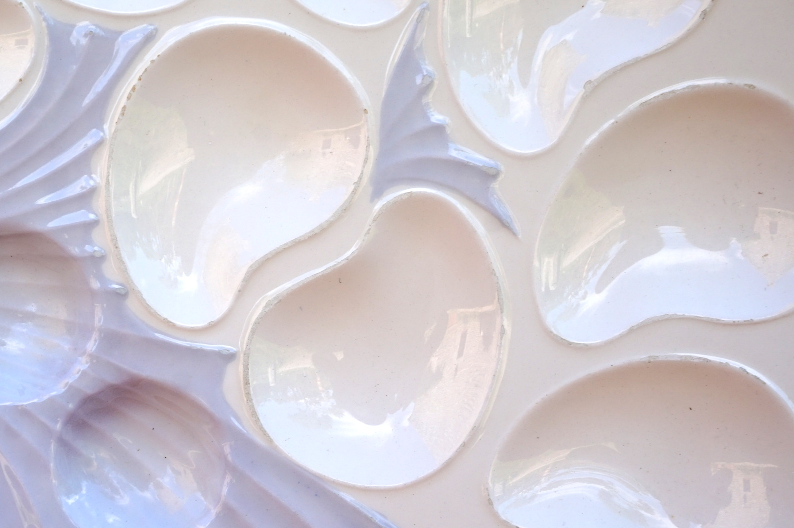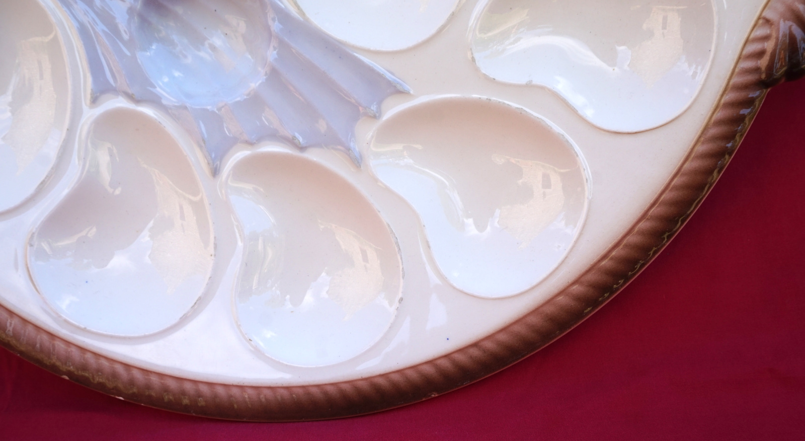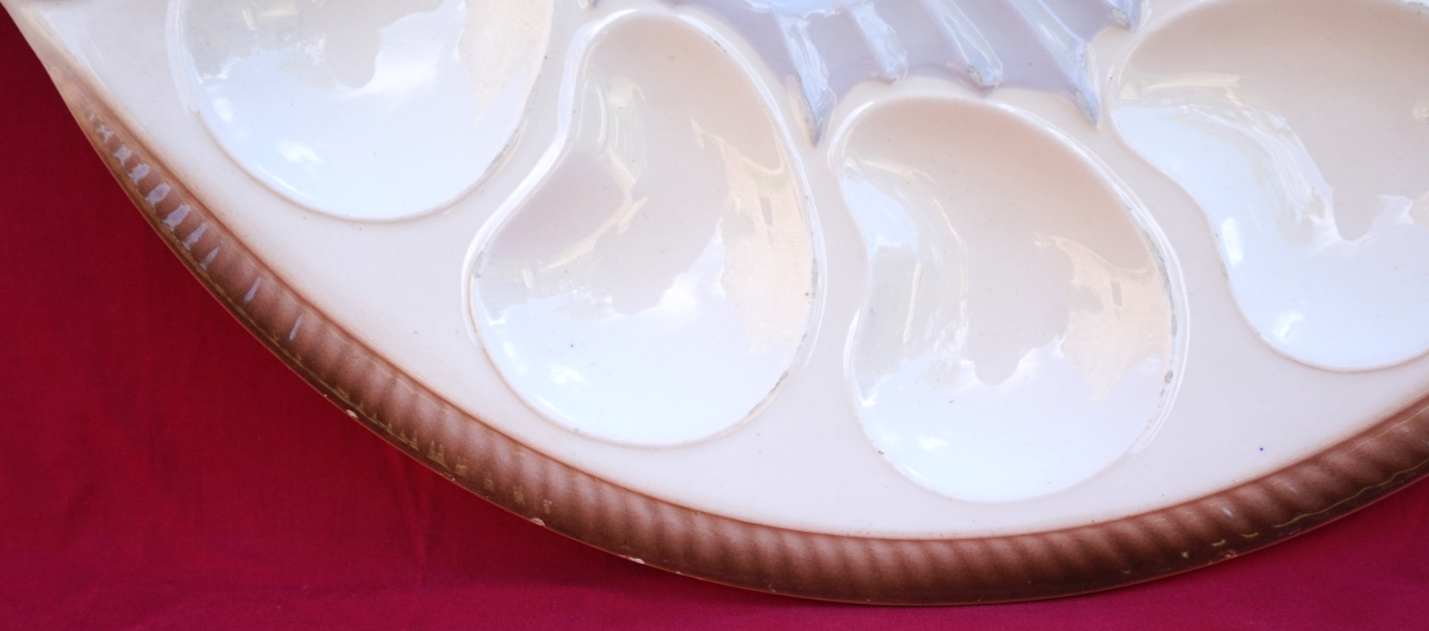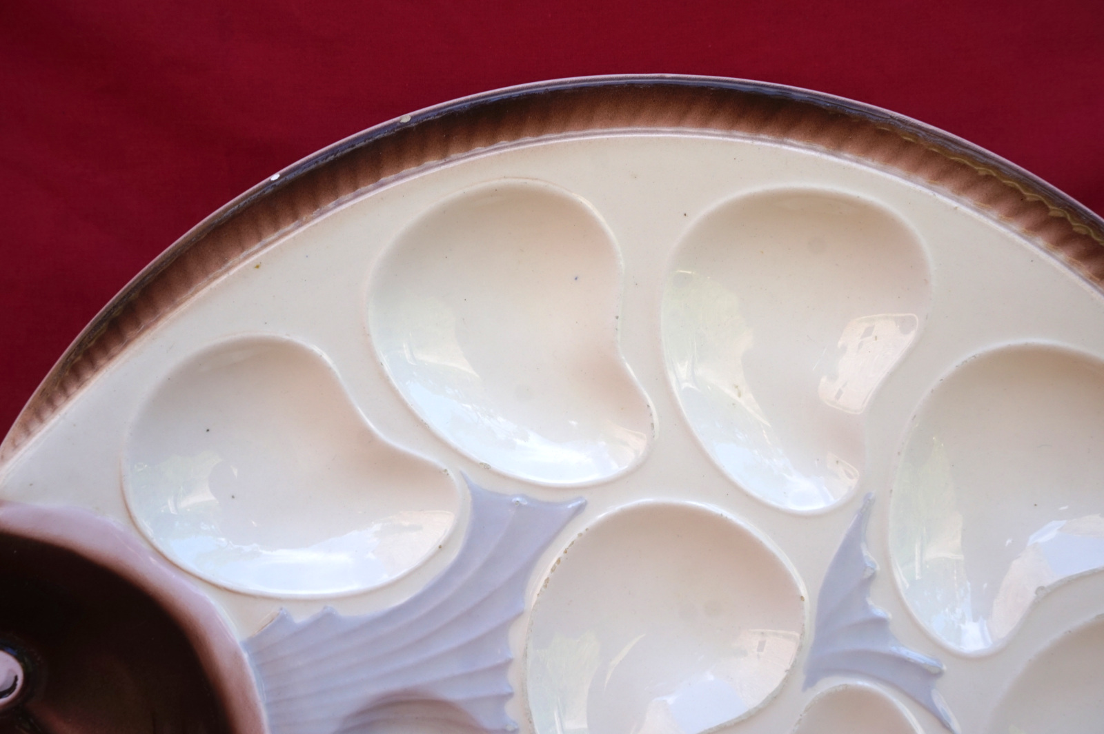 Grand plat de service pour les huitres en forme de poisson décor Copenhague par Longwy vers 1950. Il est signé sur son fond. Diamètre 37cm, largeur de la tête à la queue du poisson 42.5cm. Bel état, usures sur les bords des coquilles et deux égrenures au dos.