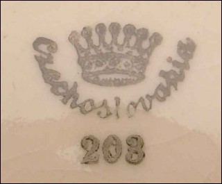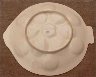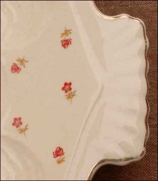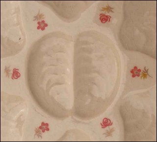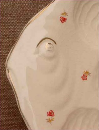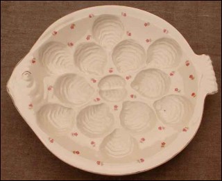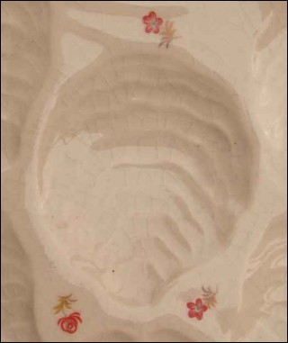 Rare fish shaped oyster dish with 12 shell wells and one central made in Czechoslovakia during the 1930's Art Deco period. the hand painted decor depicts small roses on a cream background surrounded by a gilt edge border. Good condition. 14" diameter.