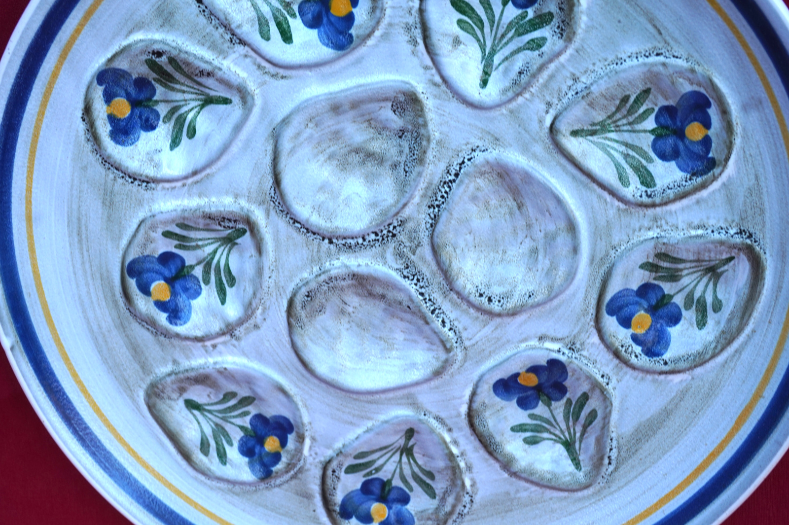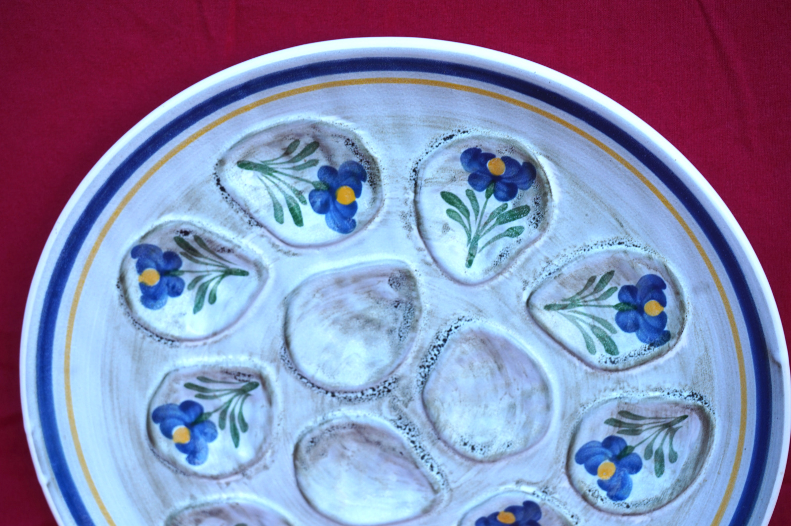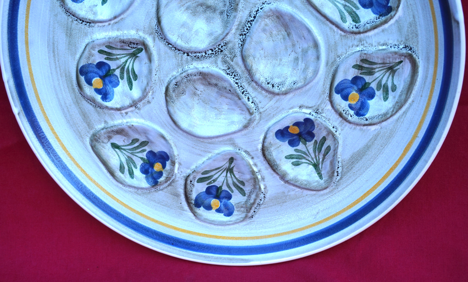 Vintage french hand painted faience oyster master server dish with 12 wells model Prisca made by Pornic during the 1950's. It's signed on the back. 13" (33cm) diameter. Perfect condition.