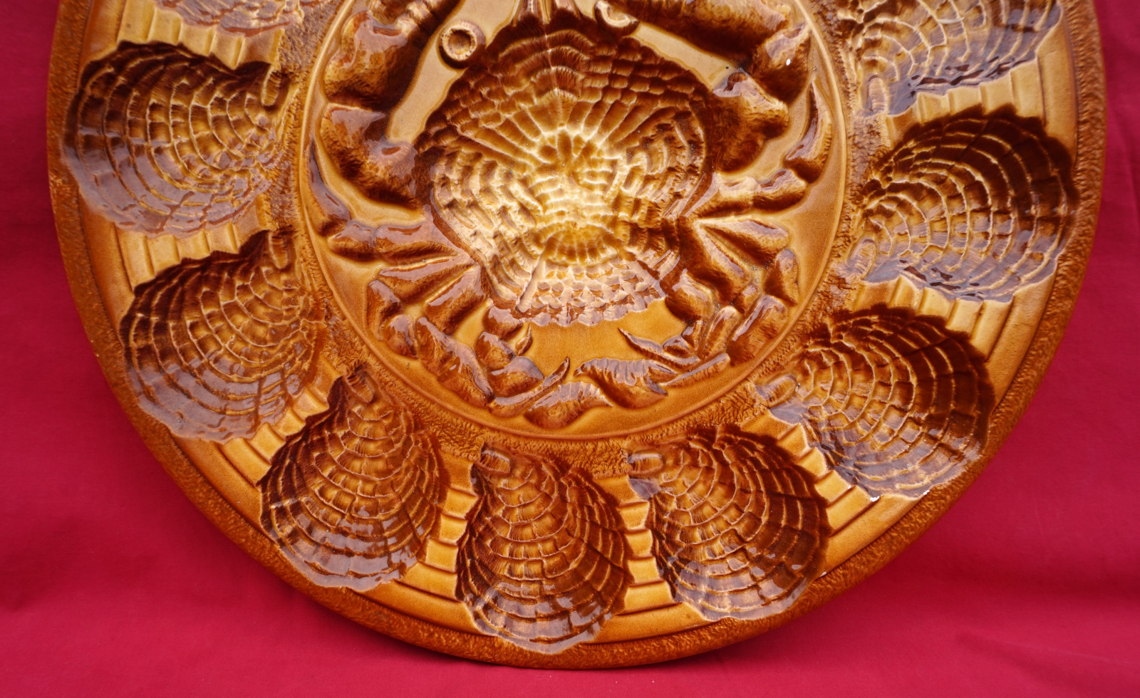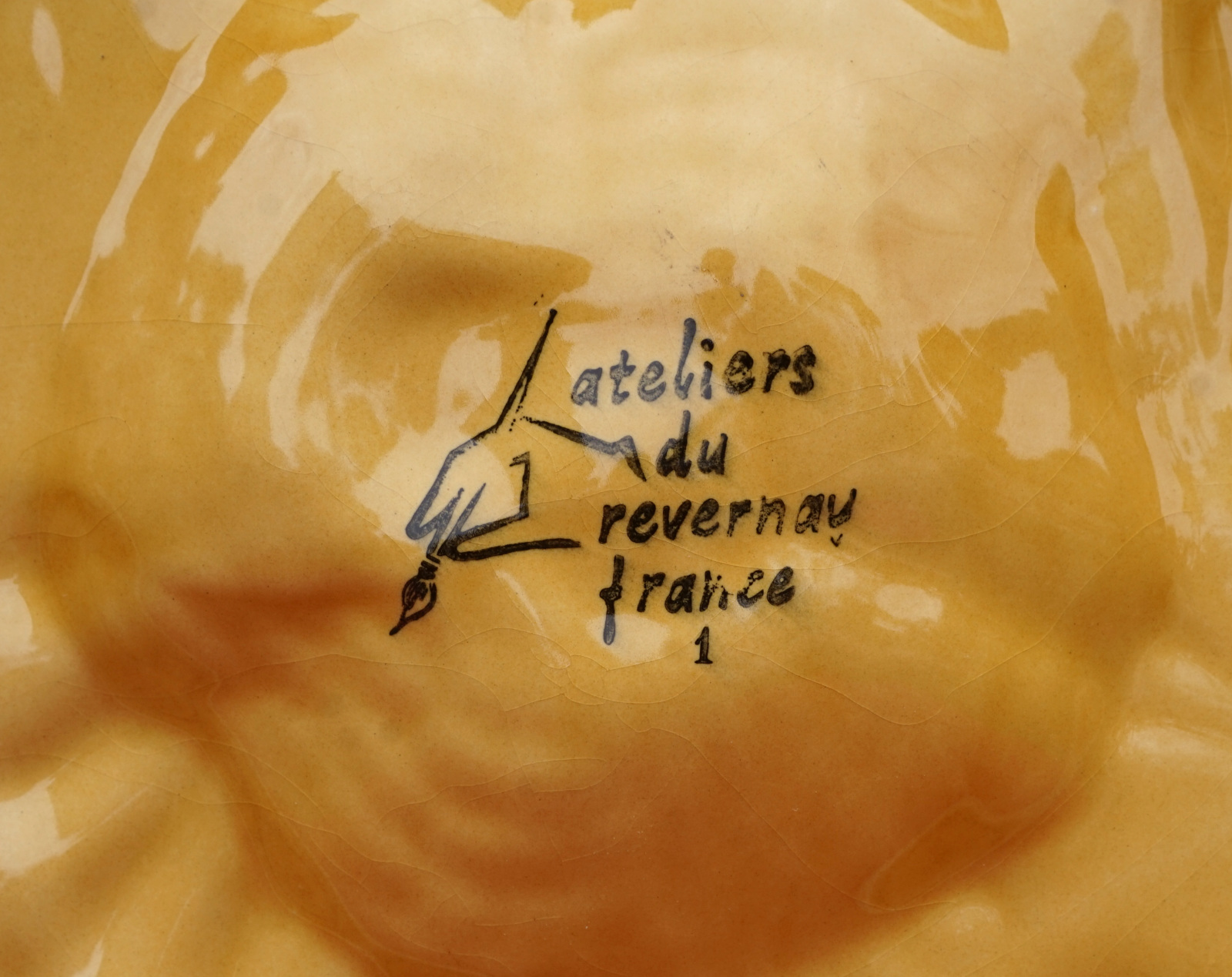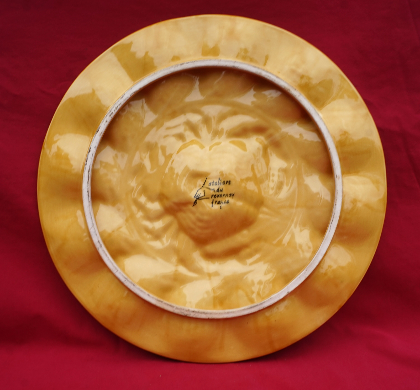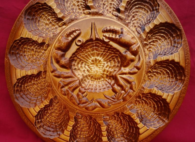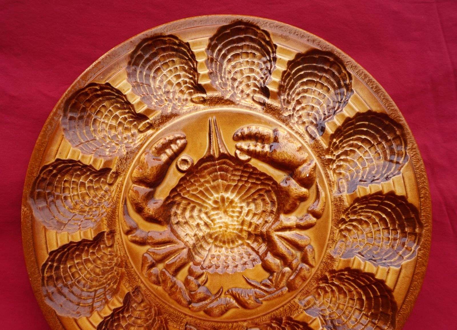 Plat de service pour les huîtres ou les fruits de mer de l'atelier du Revernay, installé près de l'ancienne manufacture dans une bâtisse appelée "château" du revernay à Digoin près de Sarreguemines, née vers 1960. Il est à douze compartiments pour les coquillages et un central orné d'un crabe. Il est en parfait état. Diamètre38.7 cm.
