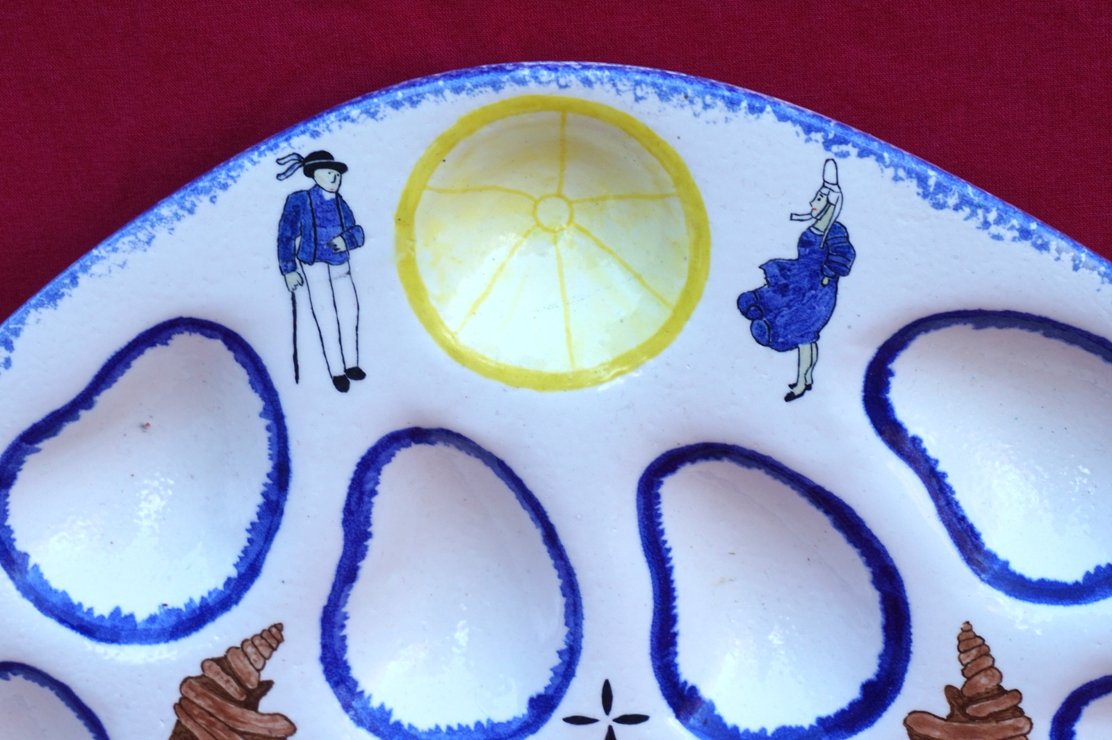 French hand painted faience triangular oyster master servers dish for 9 shells with couple of breton and shells made during the 1960's. 13 3/4" (35cm) length, 9 3/4" (24.7cm) width, 1" (2.5cm) height. Perfect condition.