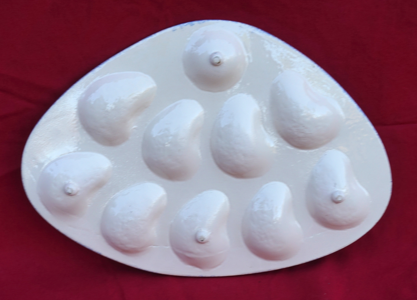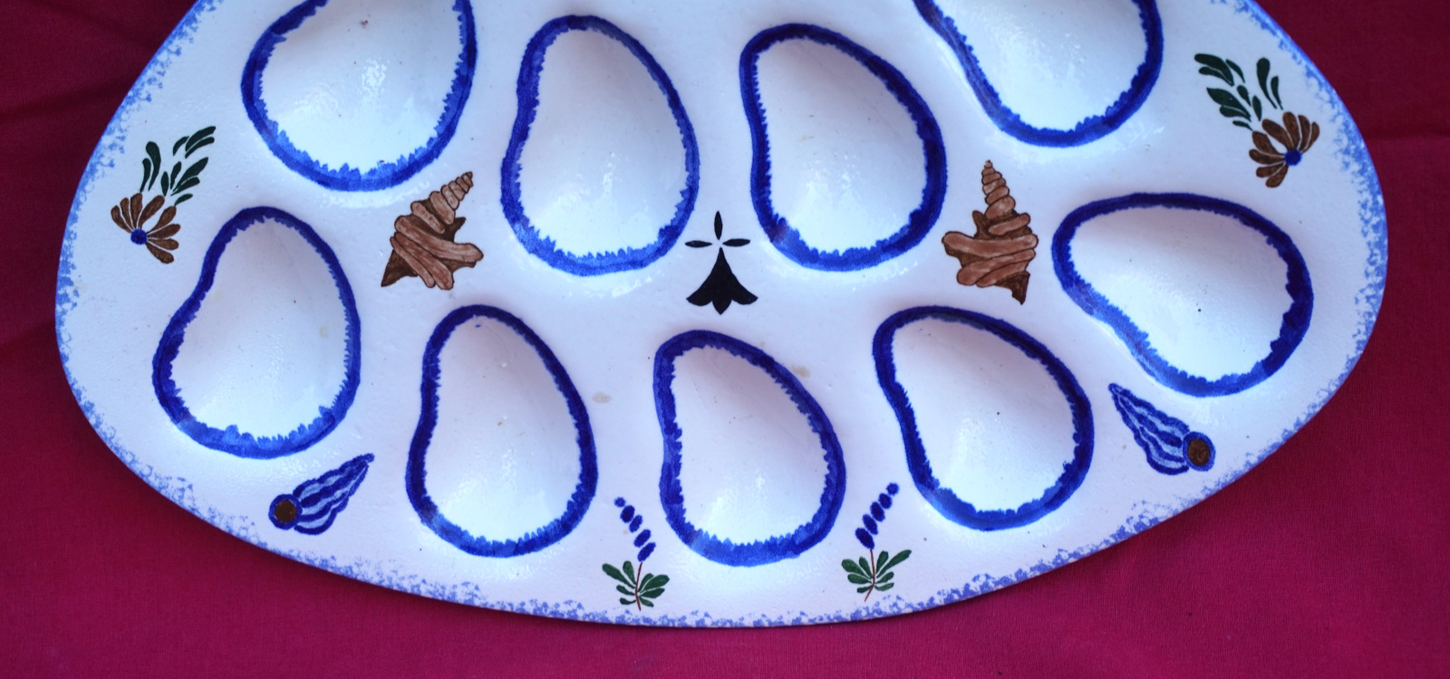 Plat à huitres triangulaire en faience peinte à la main pour 9 coquillages vers 1960. Il repose sur 3 petits pieds. Longueur 35cm, largeur 24.7cm, hauteur 2.5cm. Parfait état.