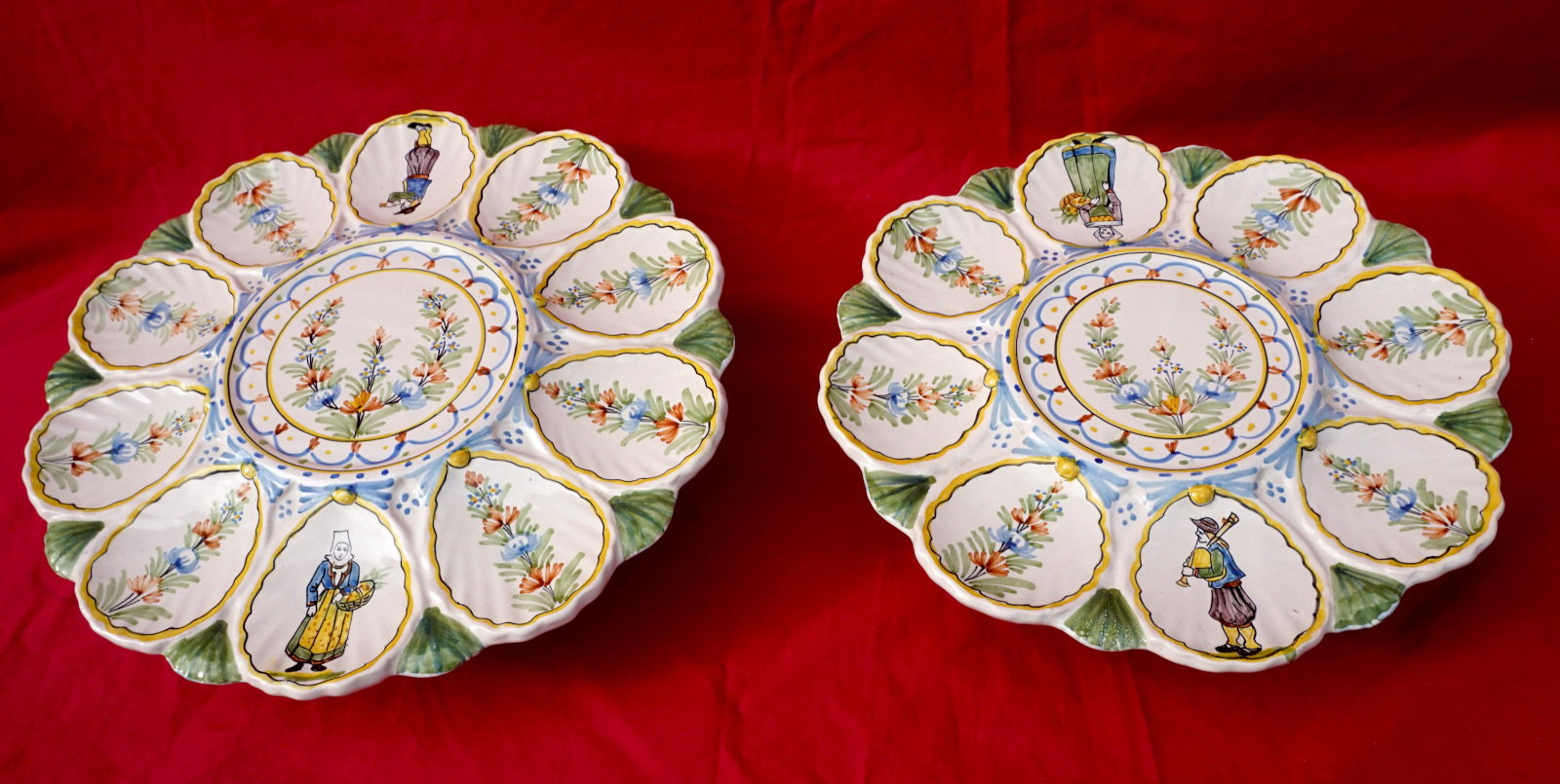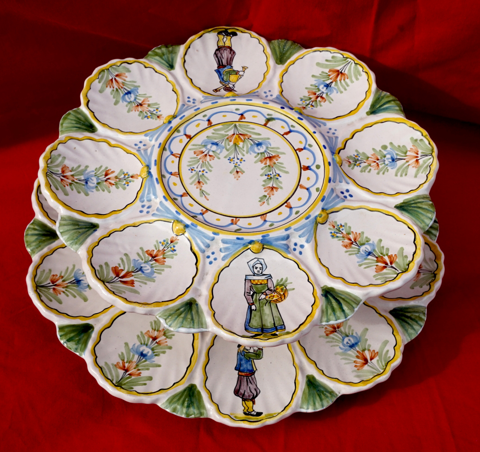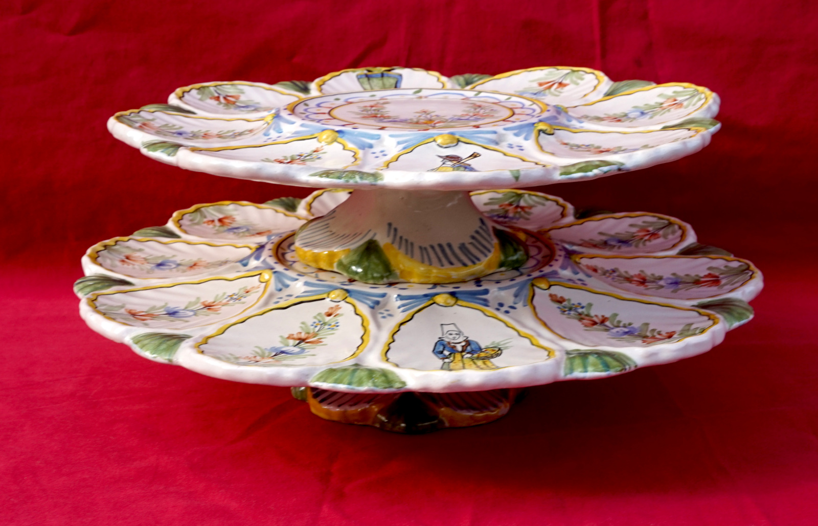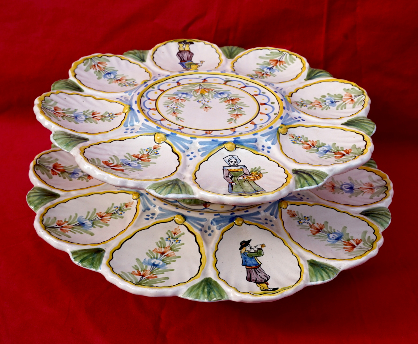 French hand painted faience scalloped oyster footed platter with 2 tiers showing bretonne with her basket and breton with his bagpipe made by HR in Quimper during the 1900's. 11" (28cm) and 9 1/2" (24.2cm) diameters, 2 3/8" (6cm) and 2 1/4" (5.7cm) height, weight of the set 3lb 8.79oz (1.610 kilograms). Signed on the back. Perfect condition as shown by the following pictures.