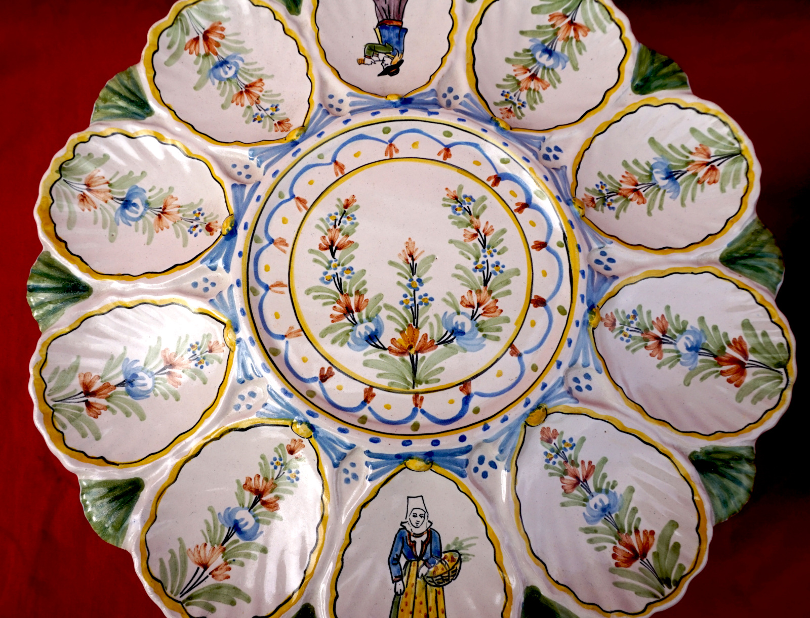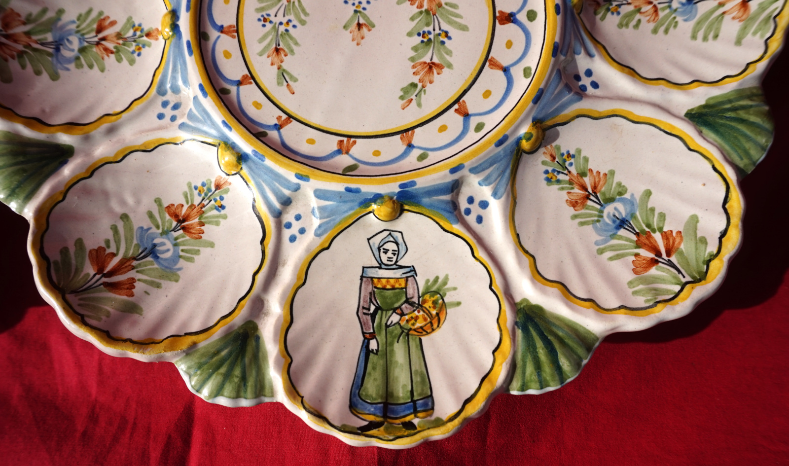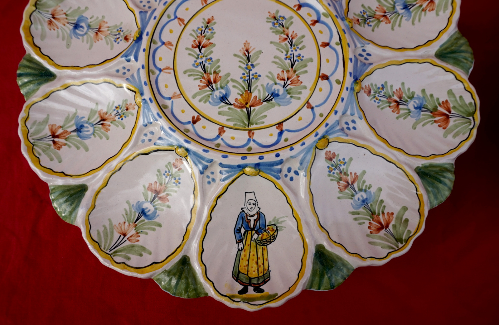 French hand painted faience scalloped oyster footed platter with 2 tiers showing bretonne with her basket and breton with his bagpipe made by HR in Quimper during the 1900's. 11" (28cm) and 9 1/2" (24.2cm) diameters, 2 3/8" (6cm) and 2 1/4" (5.7cm) height, weight of the set 3lb 8.79oz (1.610 kilograms). Signed on the back. Perfect condition as shown by the following pictures.