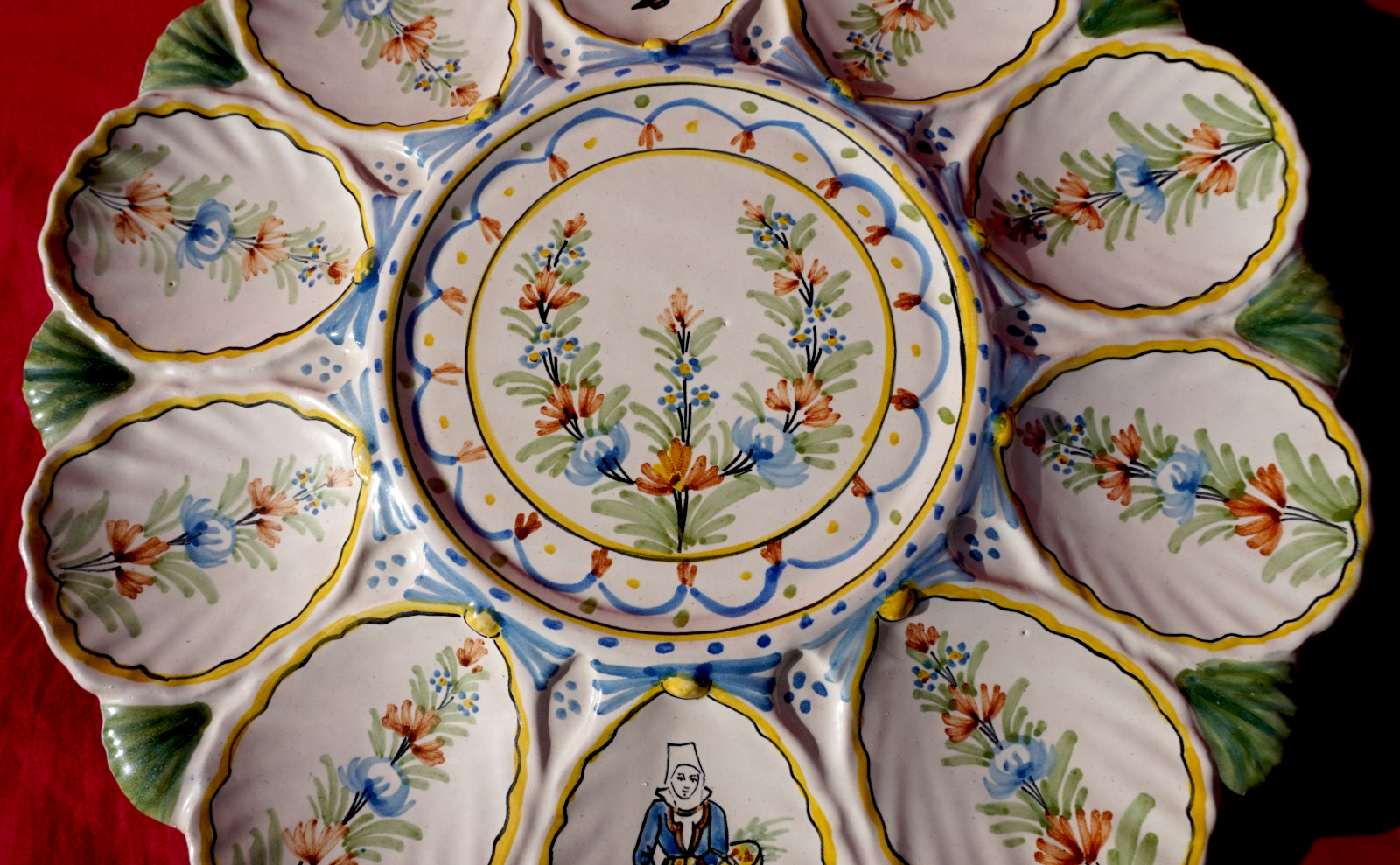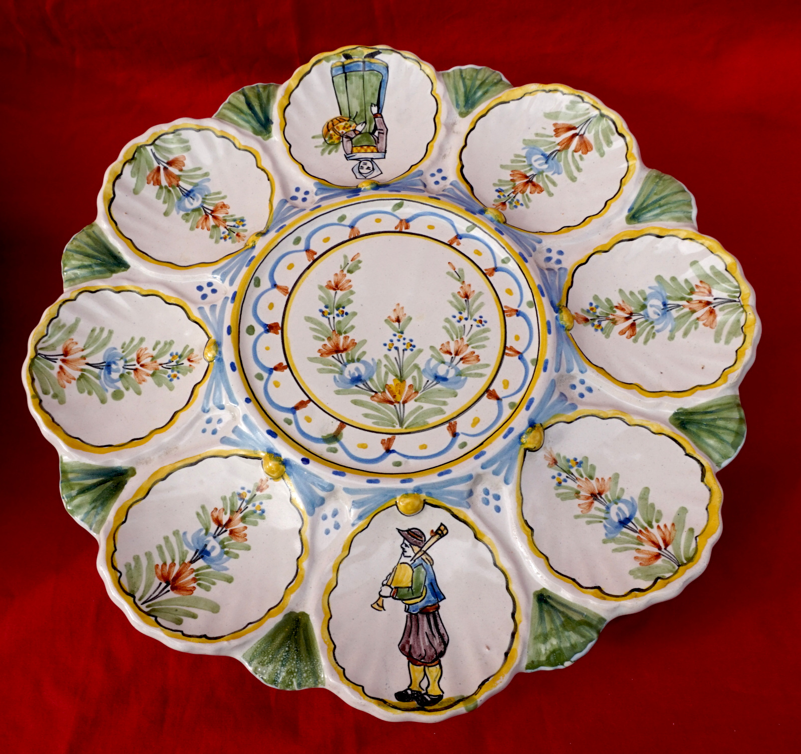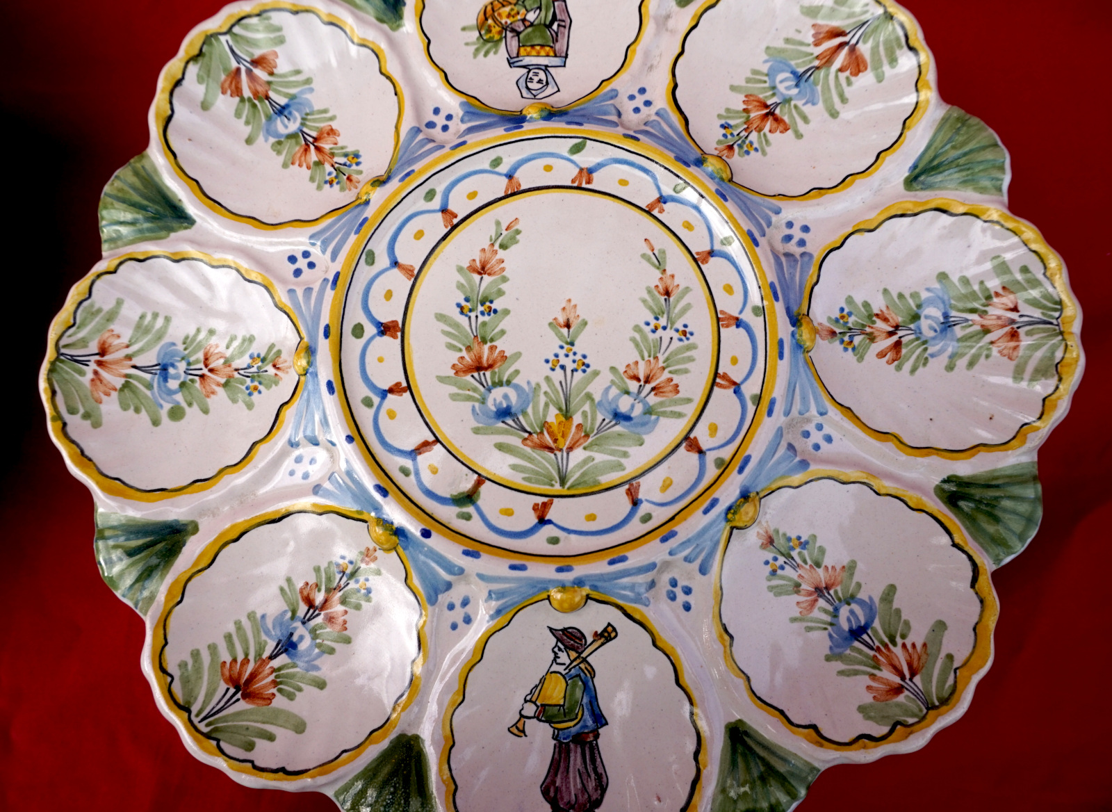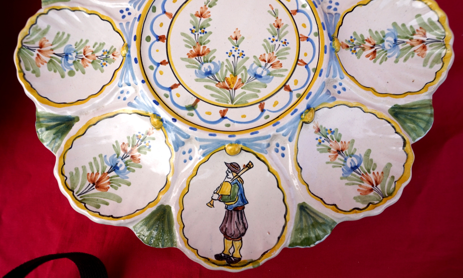 French hand painted faience scalloped oyster footed platter with 2 tiers showing bretonne with her basket and breton with his bagpipe made by HR in Quimper during the 1900's. 11" (28cm) and 9 1/2" (24.2cm) diameters, 2 3/8" (6cm) and 2 1/4" (5.7cm) height, weight of the set 3lb 8.79oz (1.610 kilograms). Signed on the back. Perfect condition as shown by the following pictures.