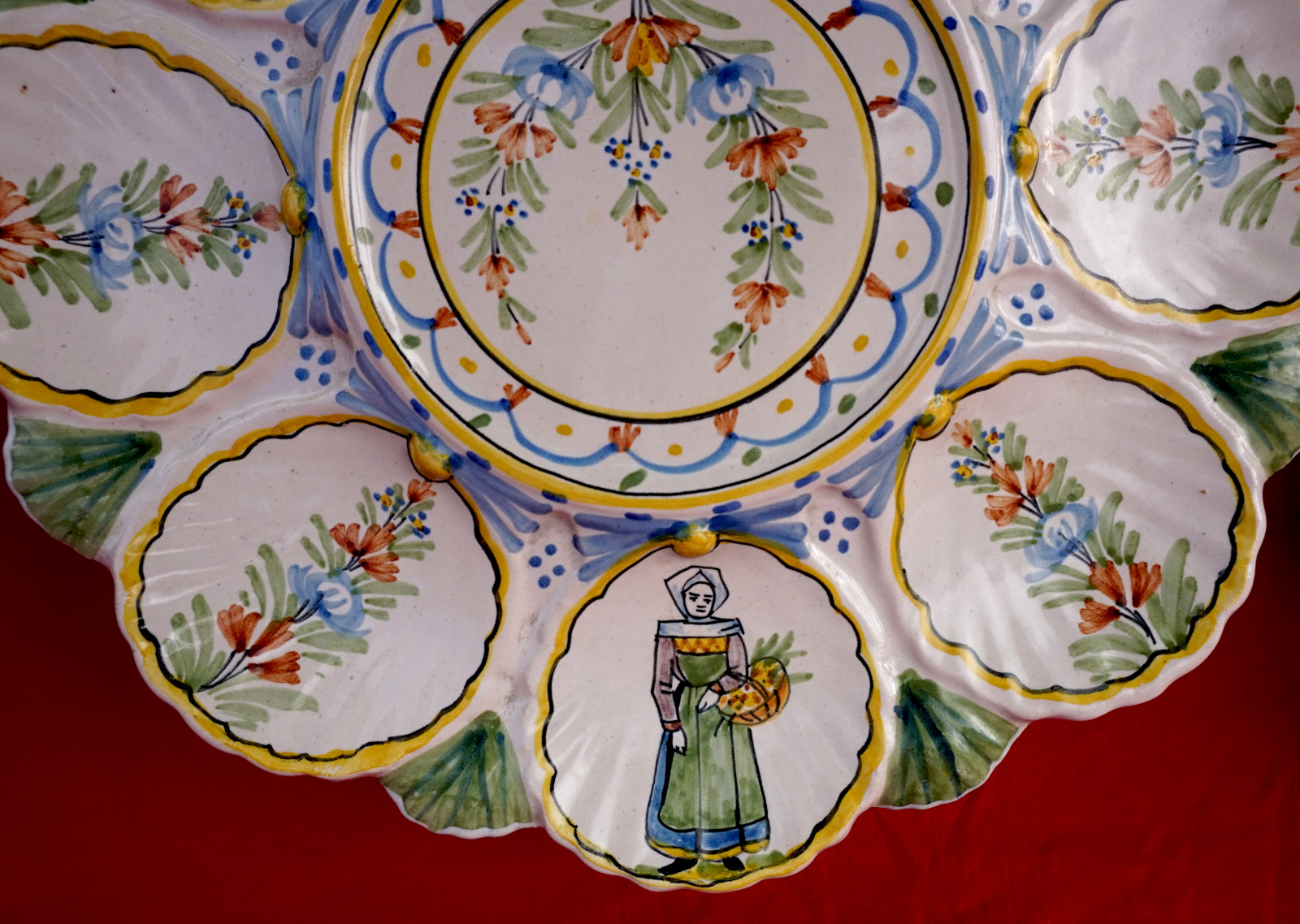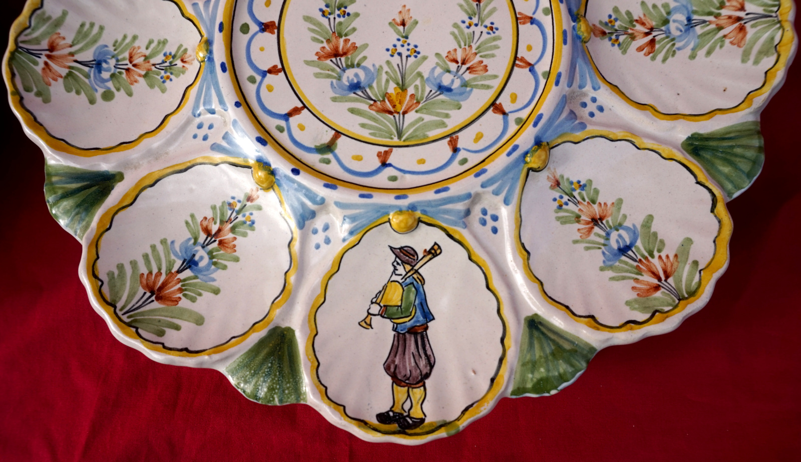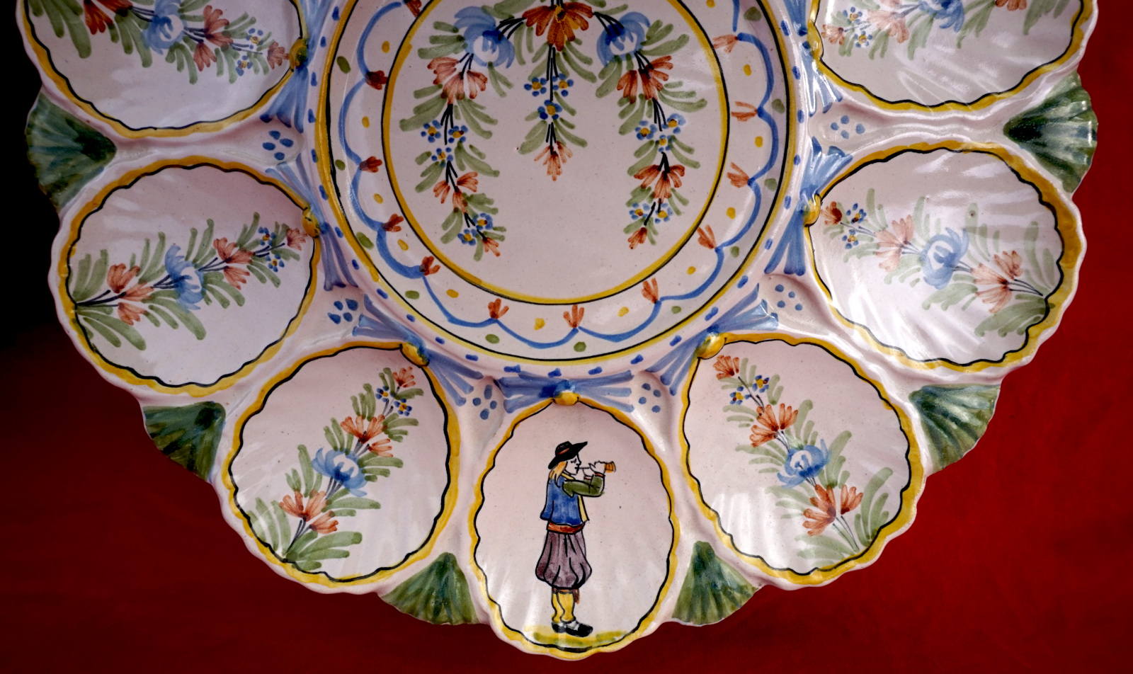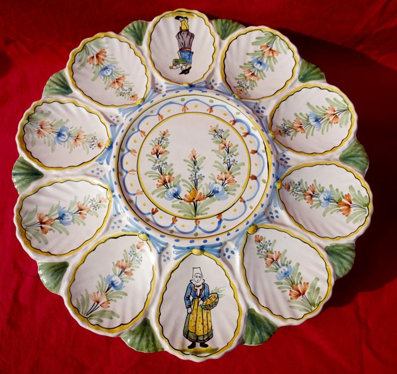 Plat de présentation pour les huitres en faience peinte à la main, 2 bretons et leurs binious et 2 bretonne avec leurs paniers, manufacture HR Quimper vers 1900. Ils sont signés sur leurs fonds. Diamètre 28 cm et 24.2 cm, hauteur 6 cm et 5.7 cm. Parfait état.