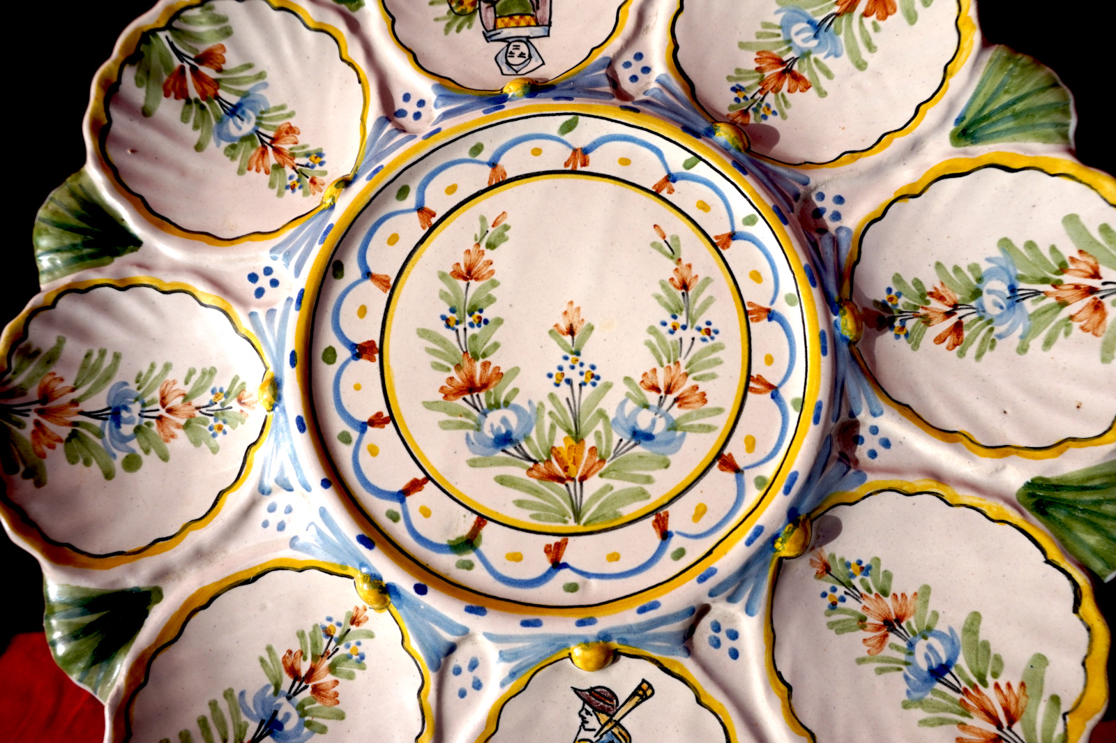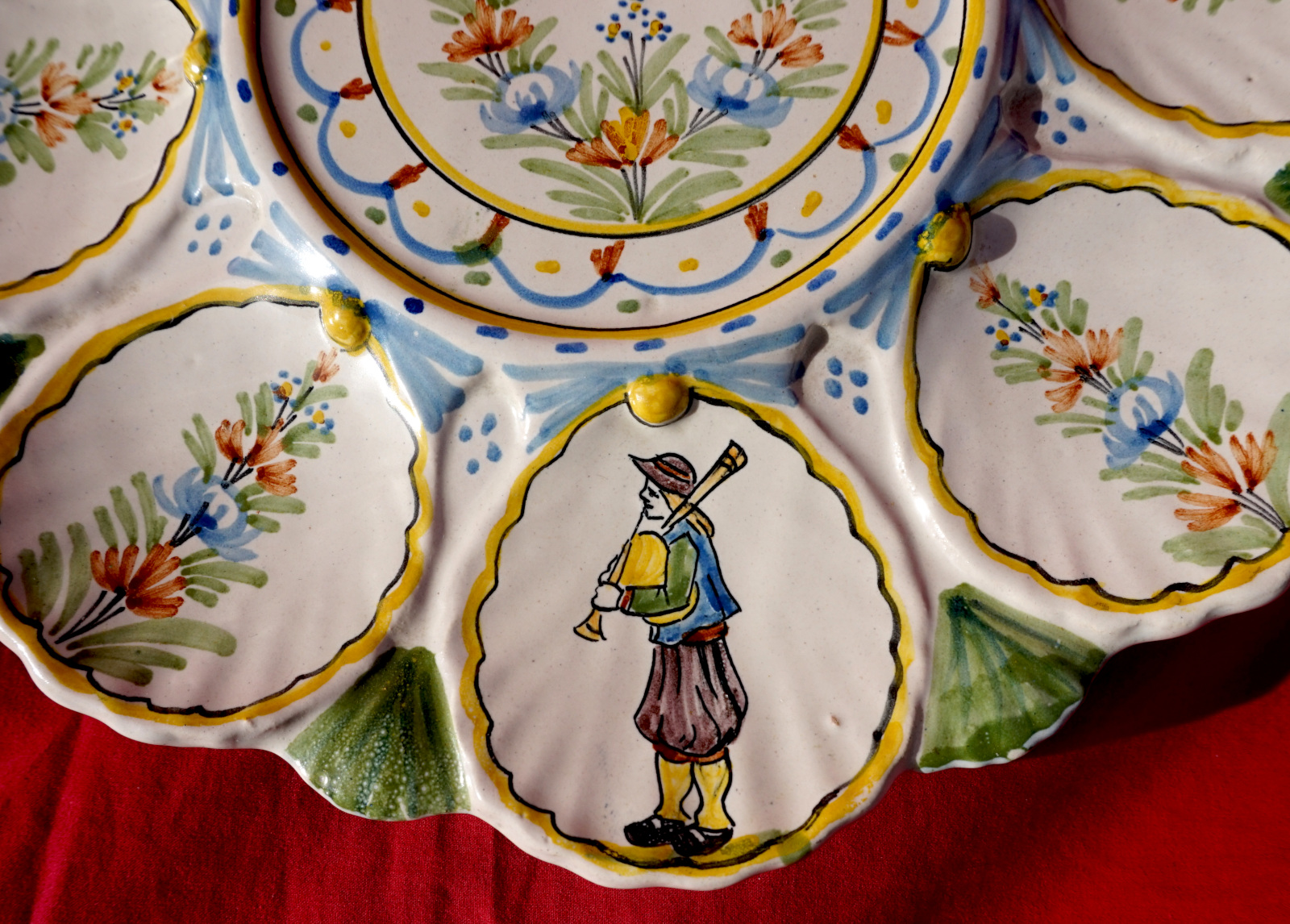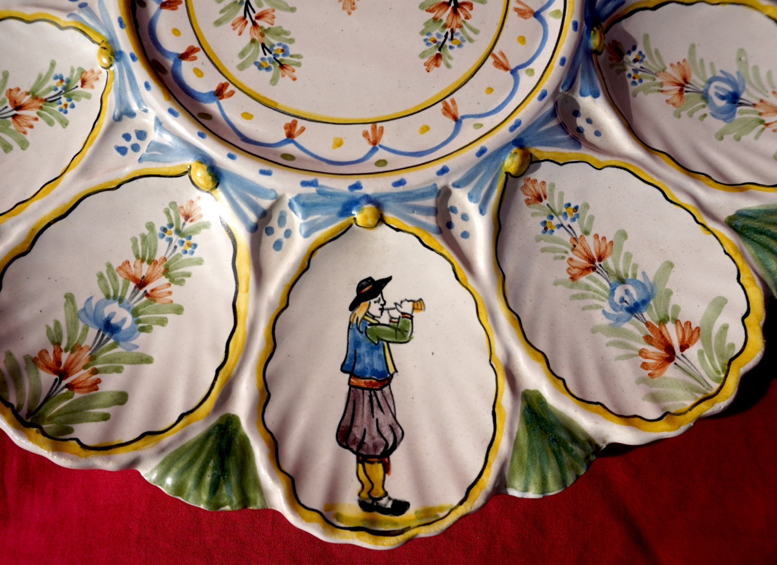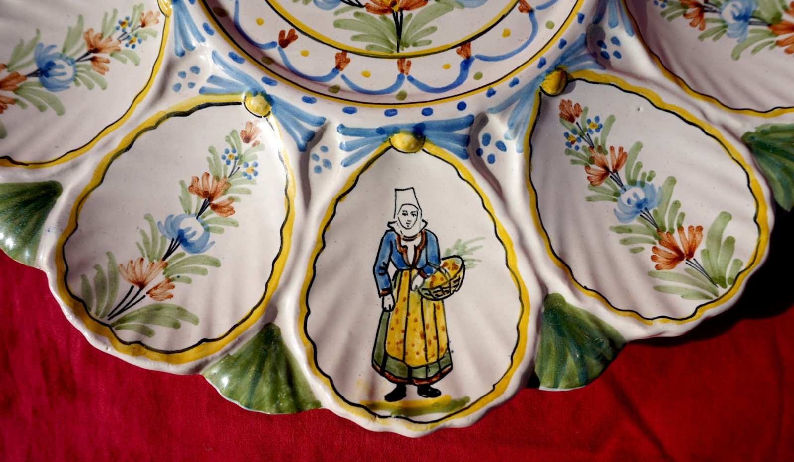 Plat de présentation pour les huitres en faience peinte à la main, 2 bretons et leurs binious et 2 bretonne avec leurs paniers, manufacture HR Quimper vers 1900. Ils sont signés sur leurs fonds. Diamètre 28 cm et 24.2 cm, hauteur 6 cm et 5.7 cm. Parfait état.
