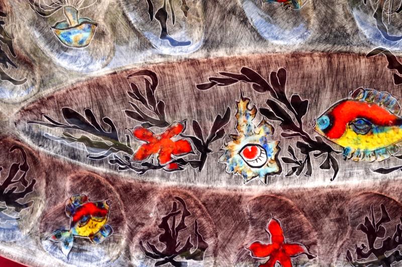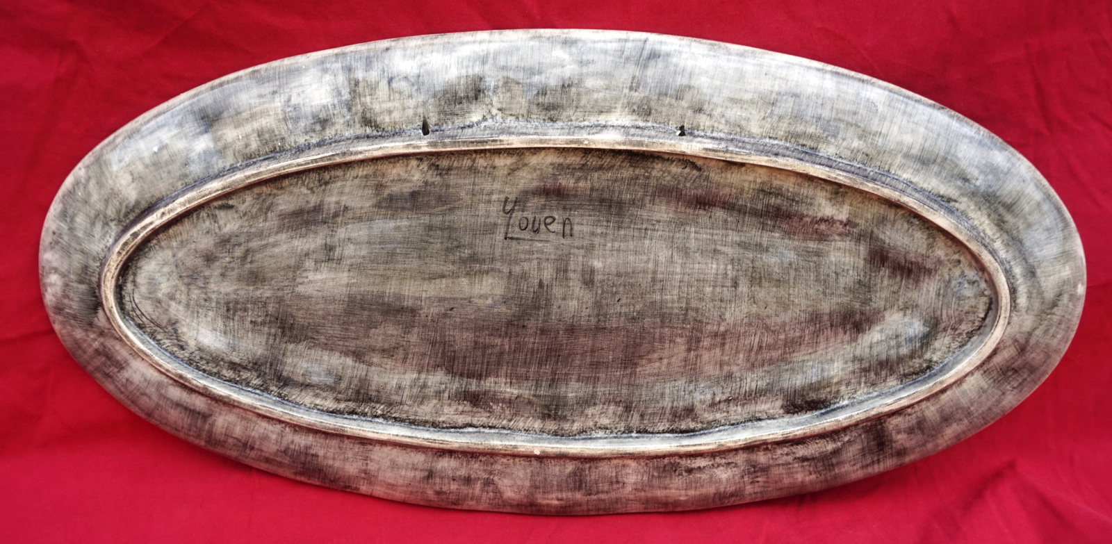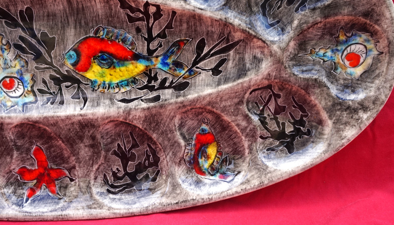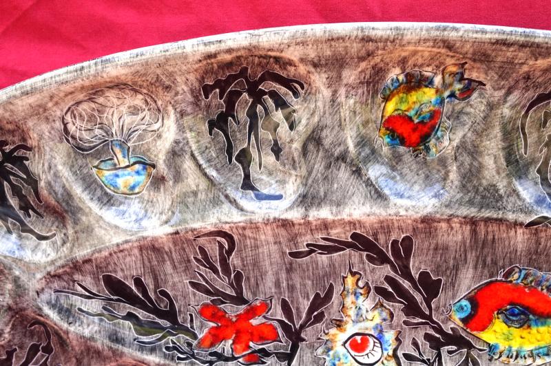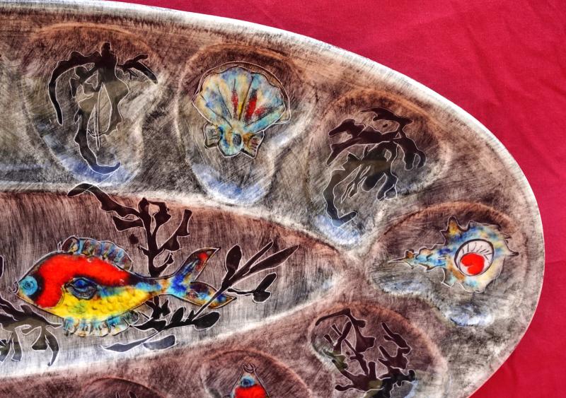 Grand plat oval pour les huitres par Youen (Yves-Alain PLEUVEN dit) à Quimper. Il est décoré de poissons, coquillages et algues. Signé au dos. Longueur 54.5 cm, largeur 26.5 cm. Très bel état, un minuscule éclat de cuisson.