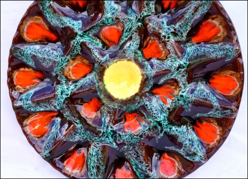 Vintage 18 wells shaped oyster platter server dish with granite decor made by Vallauris during the 1960's. 14 1/8" ( 36cm) diameter, 2" (5cm) depth. Perfect condition as shown by the following pictures.