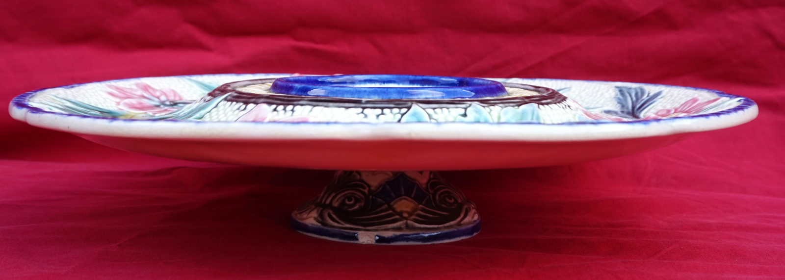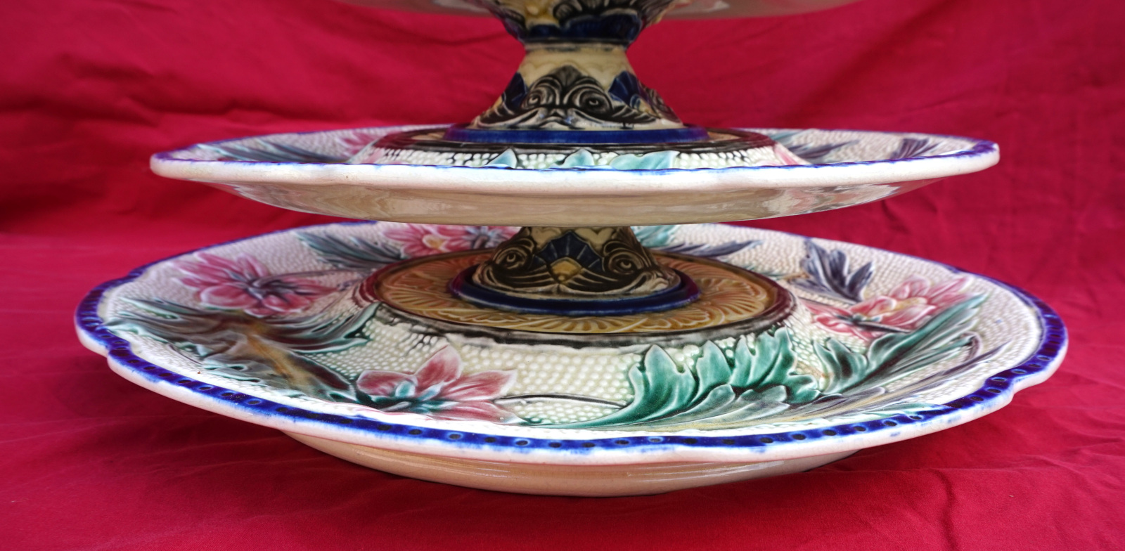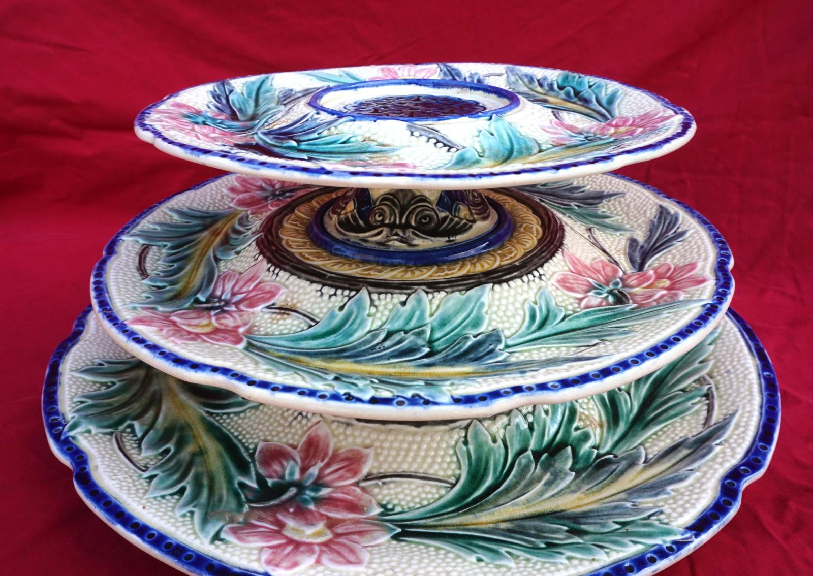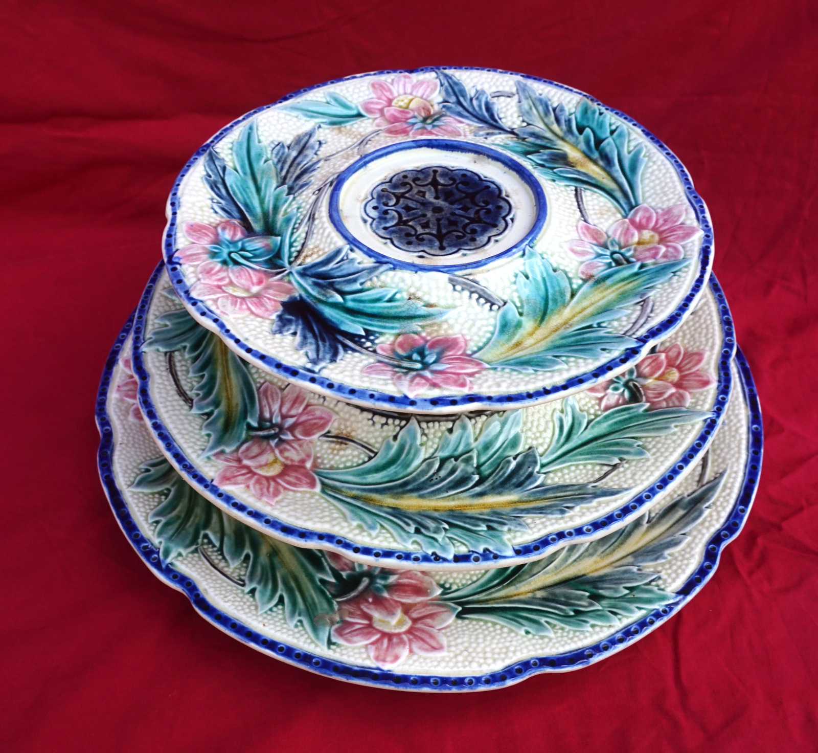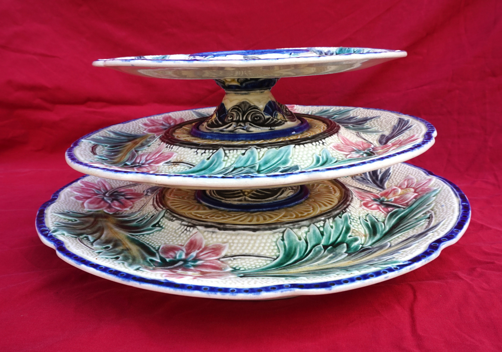 Grand palt à 3 plateaux pour le service en barbotine de Wasmuël , Belgique, fin XIX° siècle.Dimensions: pour le plus petit diamètre 25cm, le moyen 31cm, le grand 36.8cm, hauteur totale 17cm, poids 3.025kg. Toutes les pièces sont signées sur leurs fonds. Très bel état, 2 micro égrenures sur le pied du plateau intermédiaire, voir photos.