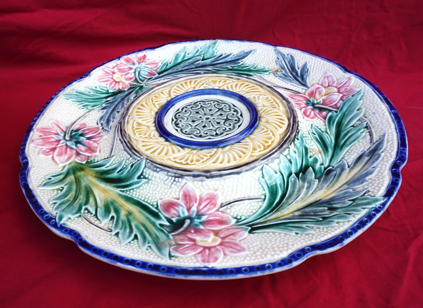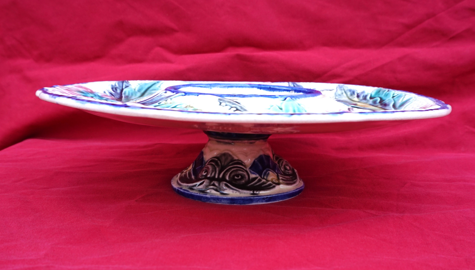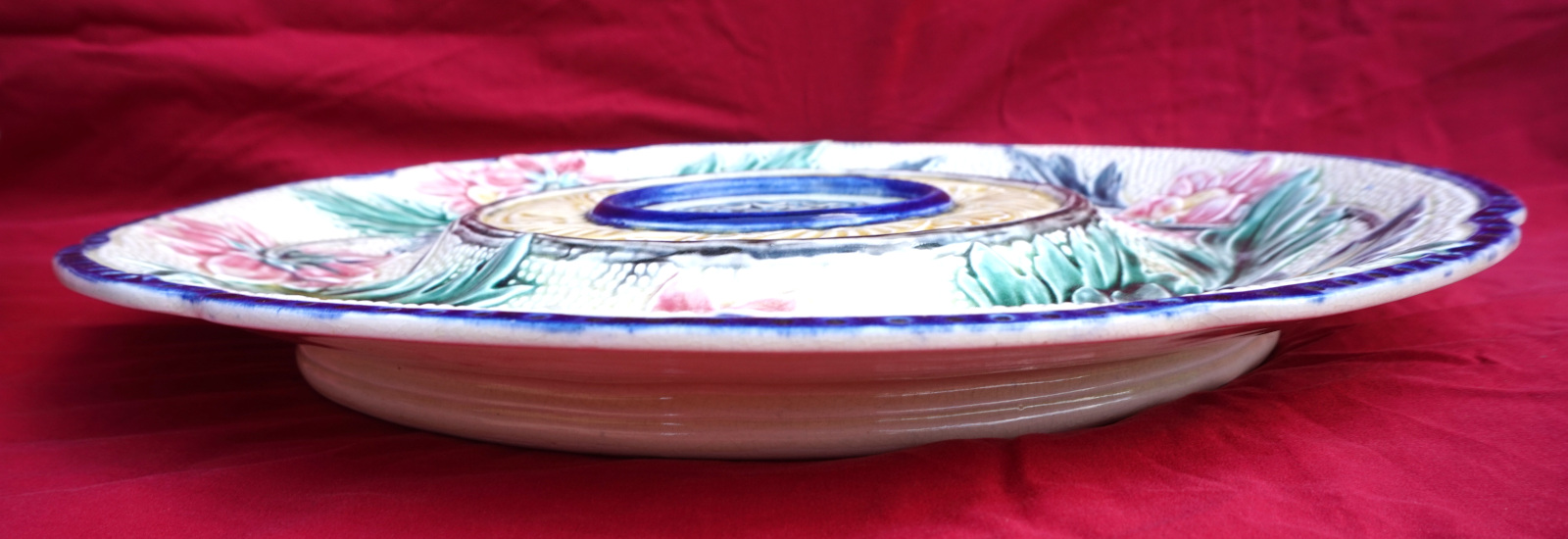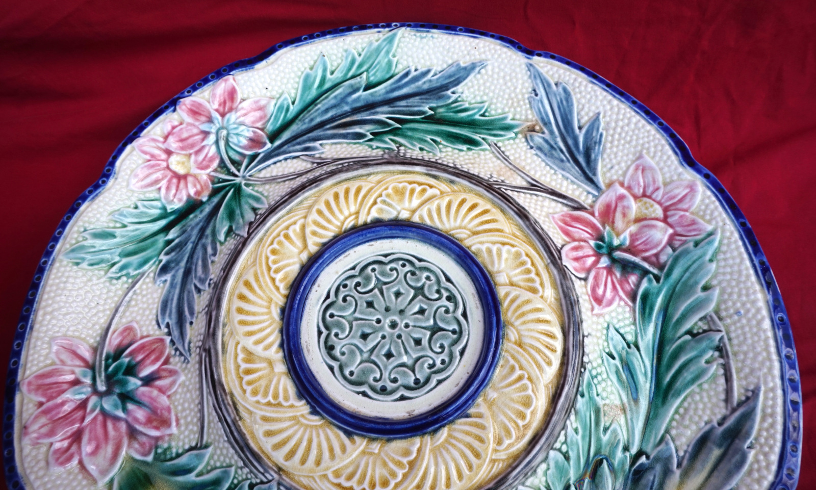 Grand palt à 3 plateaux pour le service en barbotine de Wasmuël , Belgique, fin XIX° siècle.Dimensions: pour le plus petit diamètre 25cm, le moyen 31cm, le grand 36.8cm, hauteur totale 17cm, poids 3.025kg. Toutes les pièces sont signées sur leurs fonds. Très bel état, 2 micro égrenures sur le pied du plateau intermédiaire, voir photos.