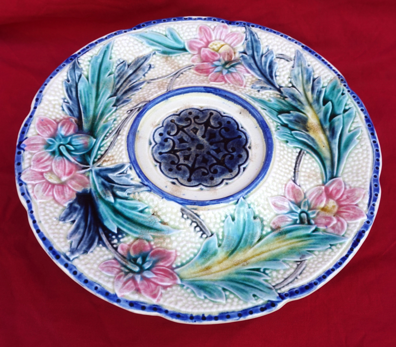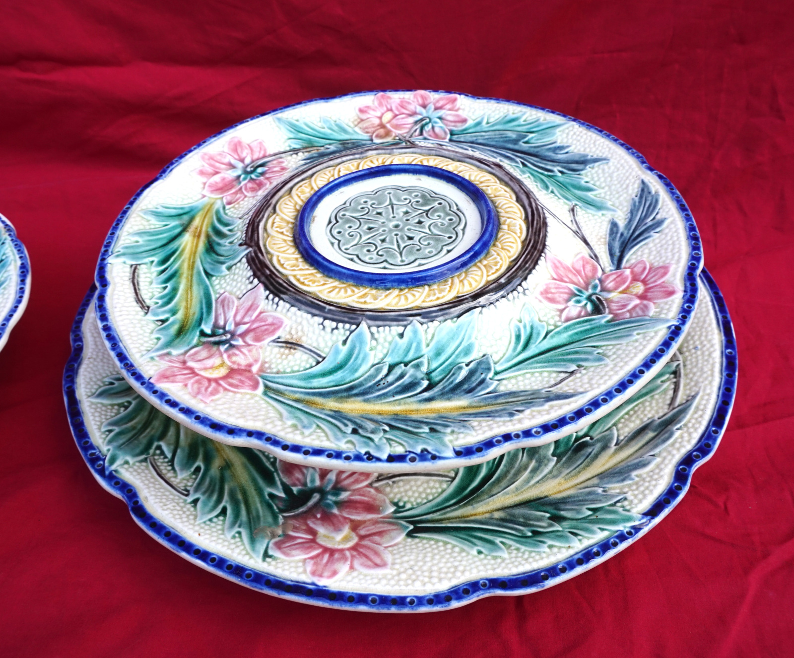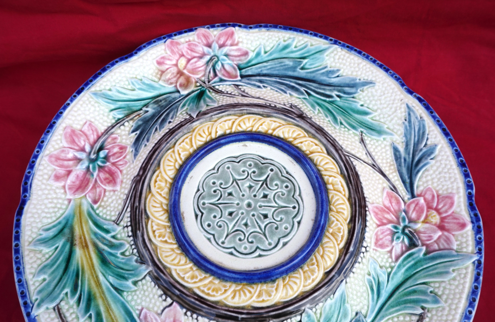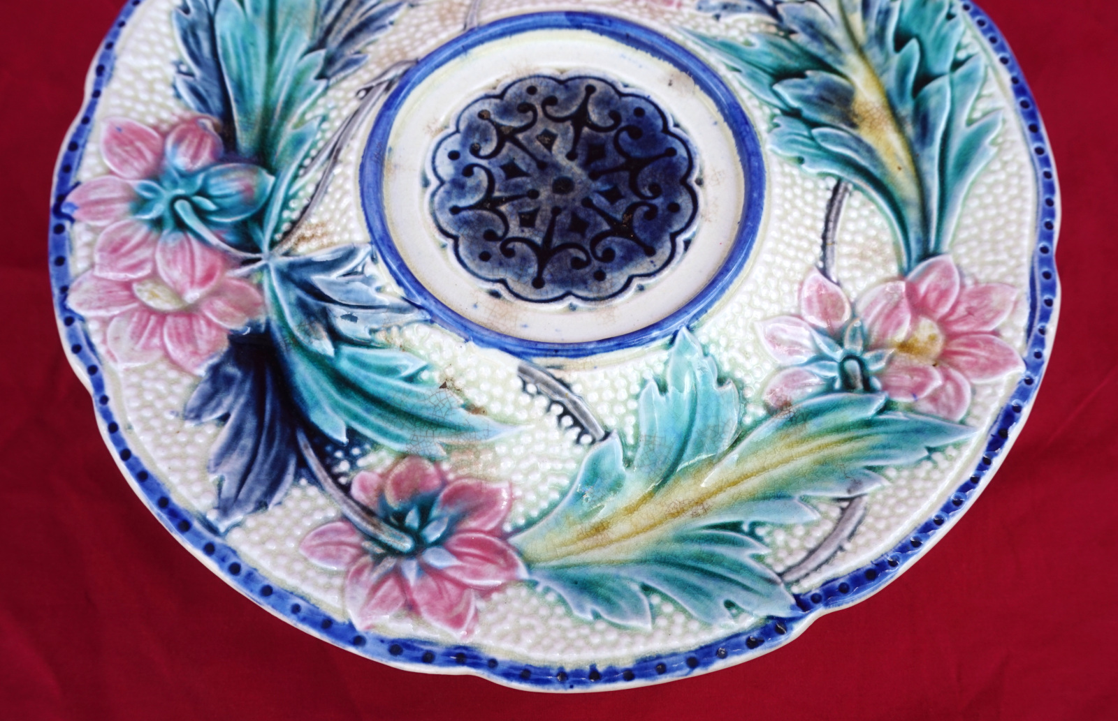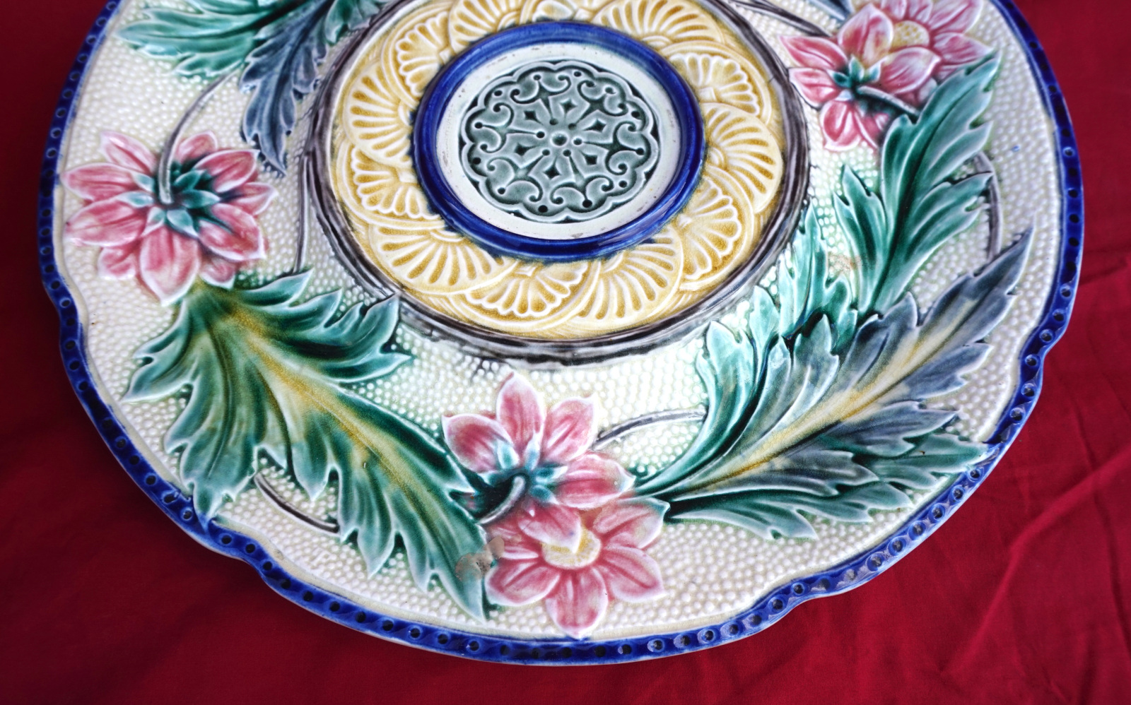 Grand palt à 3 plateaux pour le service en barbotine de Wasmuël , Belgique, fin XIX° siècle.Dimensions: pour le plus petit diamètre 25cm, le moyen 31cm, le grand 36.8cm, hauteur totale 17cm, poids 3.025kg. Toutes les pièces sont signées sur leurs fonds. Très bel état, 2 micro égrenures sur le pied du plateau intermédiaire, voir photos.
