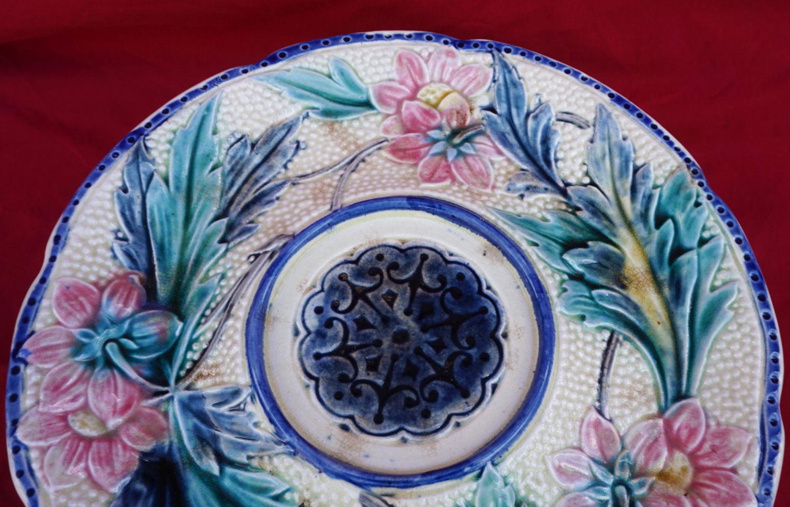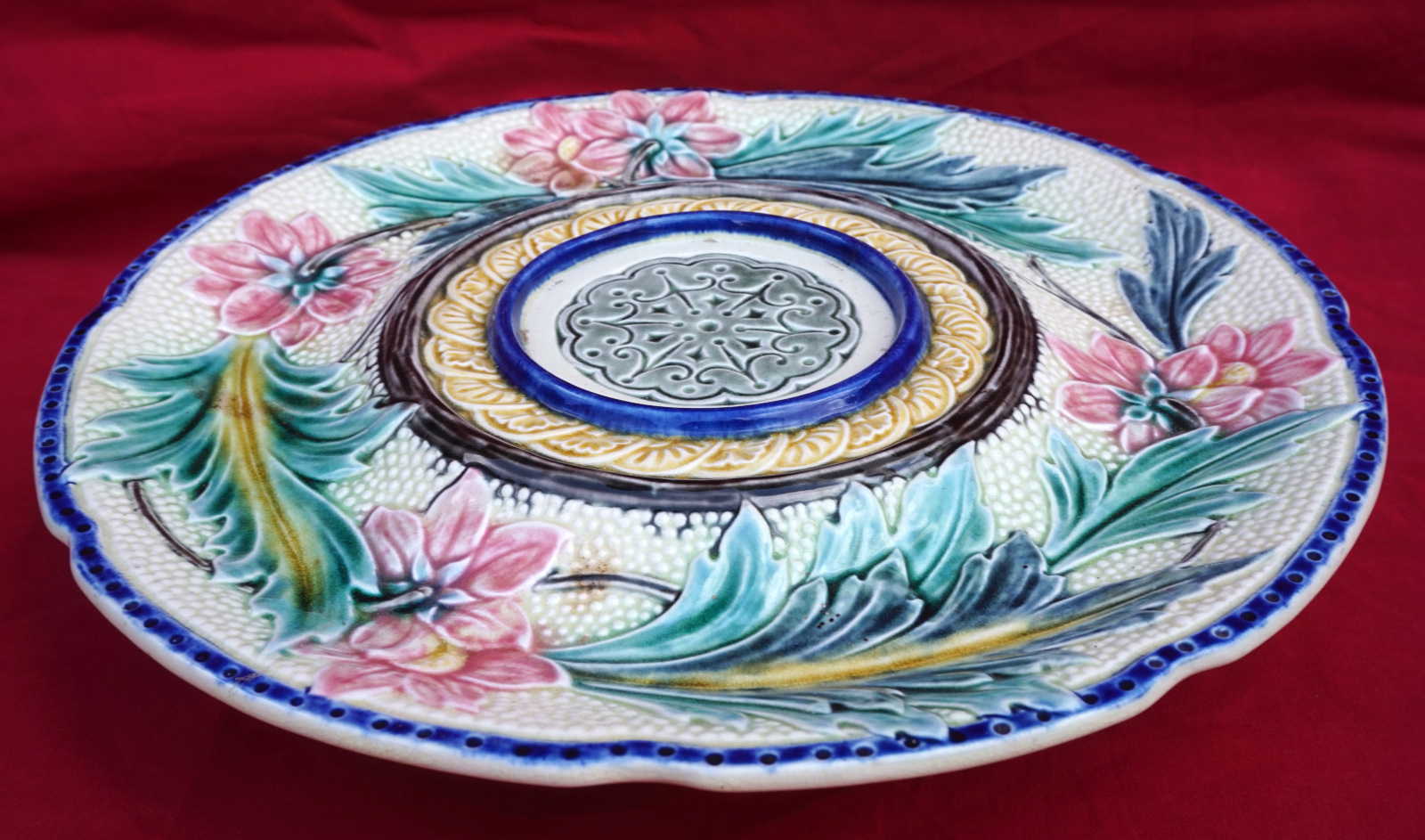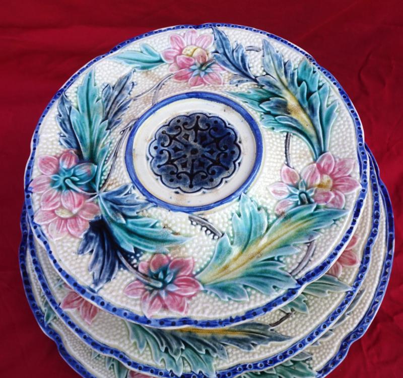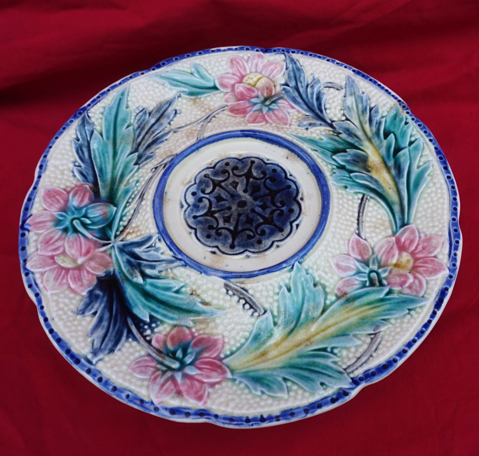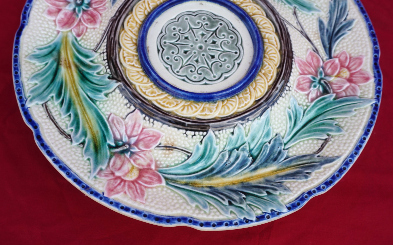 Grand palt à 3 plateaux pour le service en barbotine de Wasmuël , Belgique, fin XIX° siècle.Dimensions: pour le plus petit diamètre 25cm, le moyen 31cm, le grand 36.8cm, hauteur totale 17cm, poids 3.025kg. Toutes les pièces sont signées sur leurs fonds. Très bel état, 2 micro égrenures sur le pied du plateau intermédiaire, voir photos.