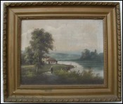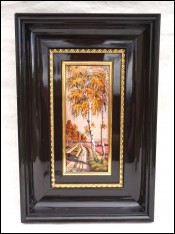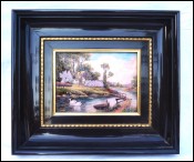 LIMOGES Cottage on the Riverside Swan P Derigon Framed Enamel Painting Signed