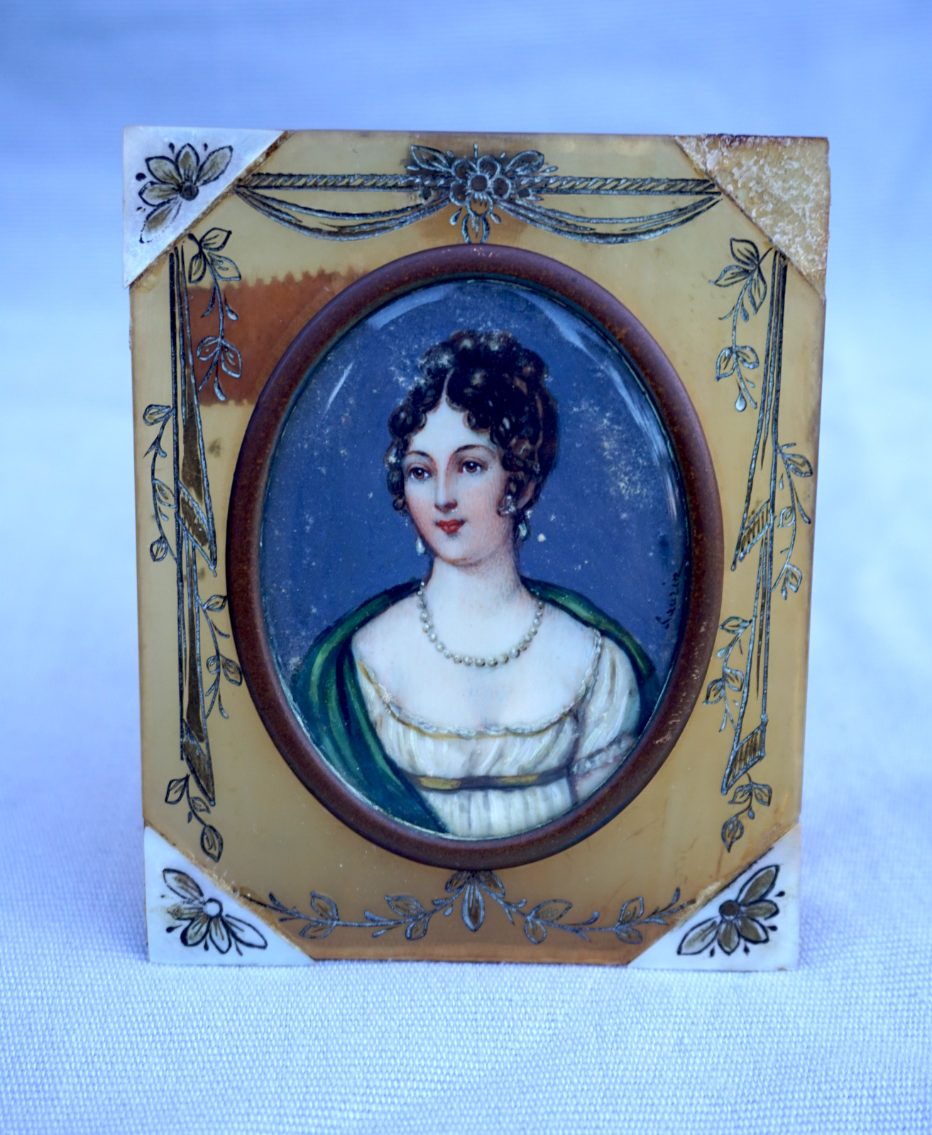Young Lady Miniature Painting Engraved Horn Framed Signed 1840's