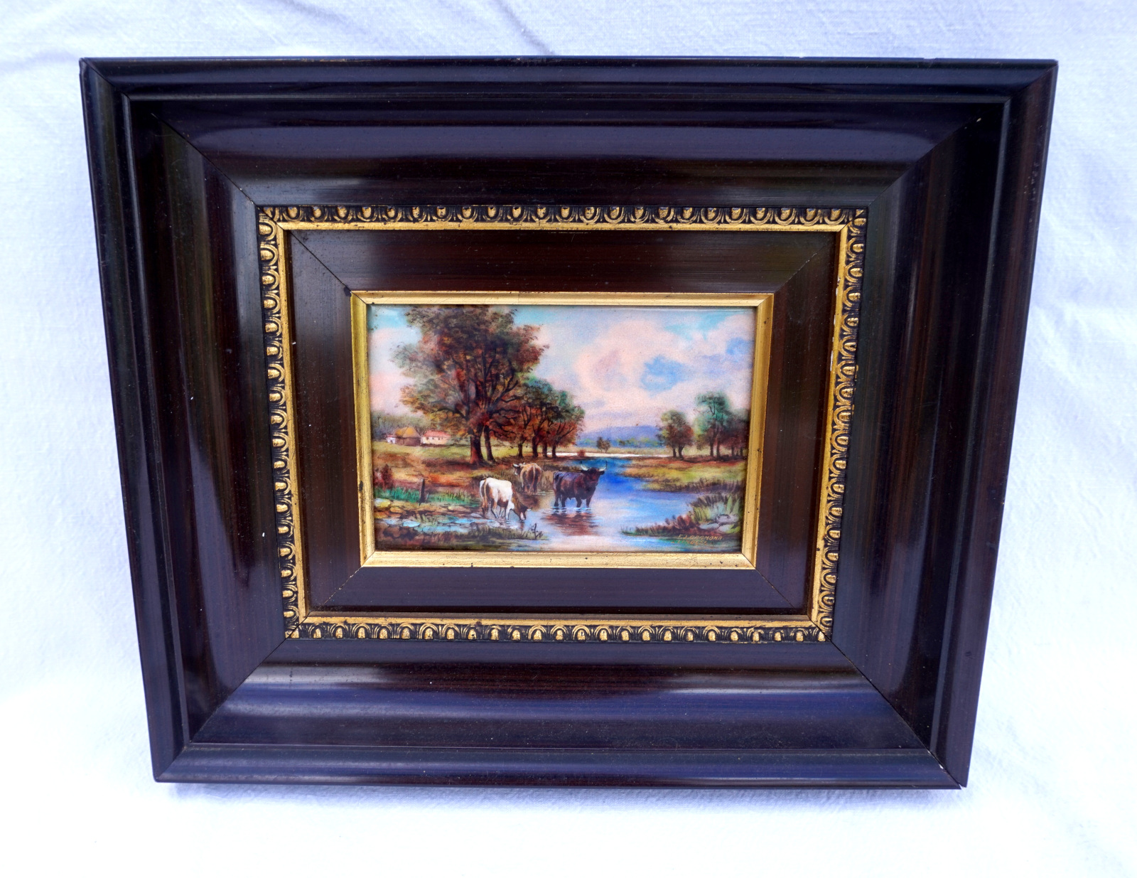 Cows and Bull at the River Enamel Painting Limoges F J Carmona