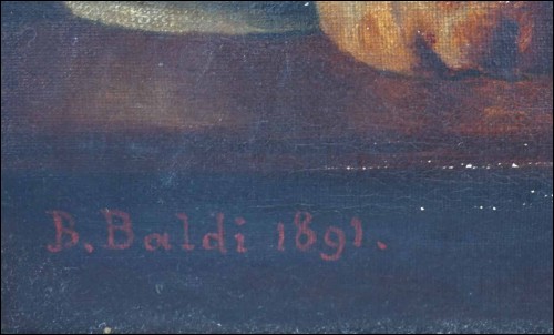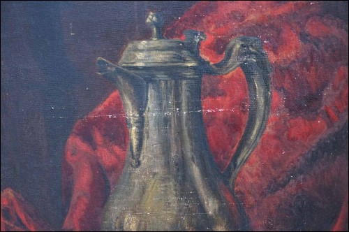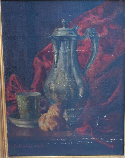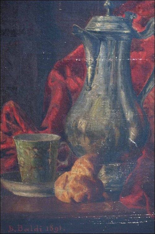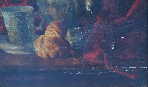 Still life with pewter pitcher framed oil on canvas painting made by B Baldi Bologna, Italy, artist made during a Paris travel in 1891. It's signed and dated in the left bottom corner. It measures for the painting 14" (35.5cm) height by 10 5/8" (27cm) width and for the frame 16 1/2" (41.7cm) height by 13 1/4" (33.5cm) width. Good condition , small scratches on the painting as shown by the following pictures.