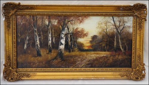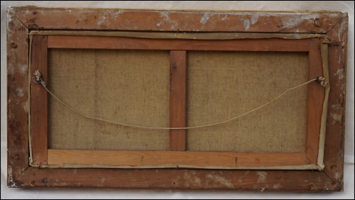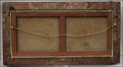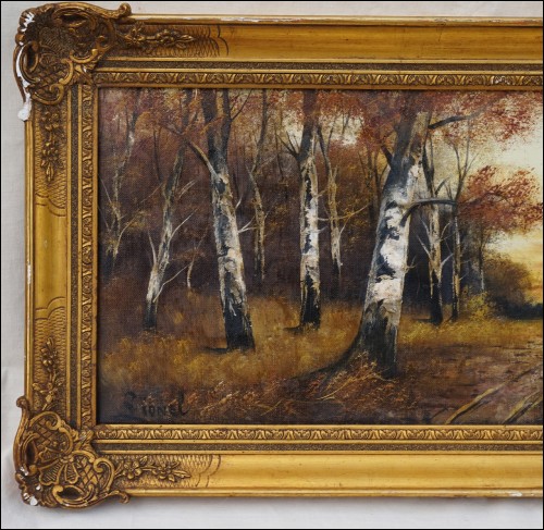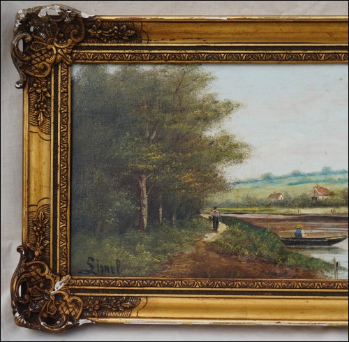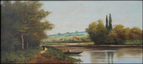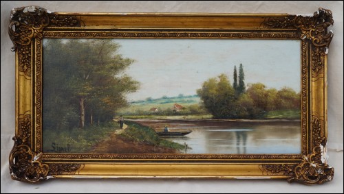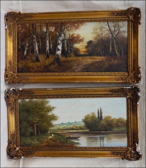 Pair of framed oil on canvas showing a forest and river with fisher and small boat made by Lionel artist from the Barbizon school during the second half of the 19th century.Size of the canvas: 23 1/2" width by 10 7/8" height. They are signed on the left bottom. The gilt frames are slighty used, the painting are in very good conditiononly an old re-paint on the riverscape as presented on the following pictures.