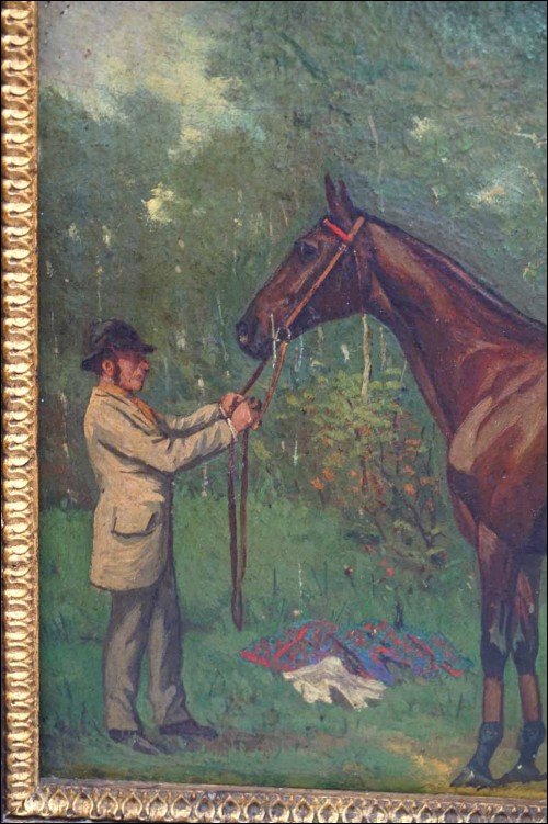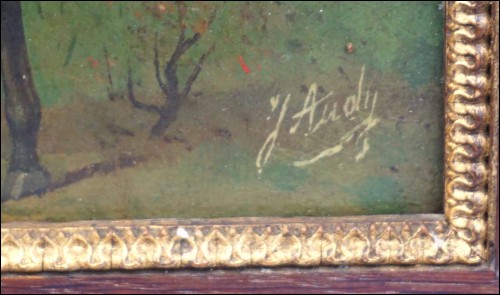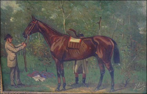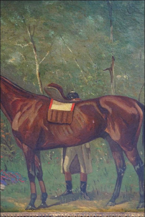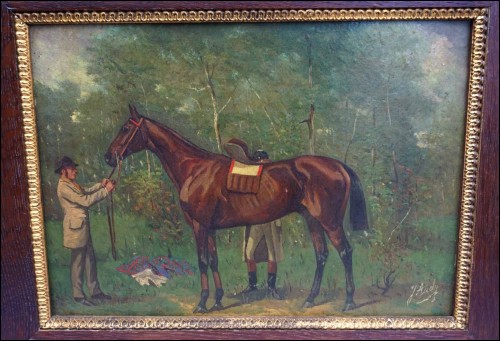 Before the hunting, framed oil on panel showing ridder saddling his horse made by Jonny Audy during the second half of the 19th century. It's signed on the right bottom corner. 12 1/2" (32cm) by 9 1/4" (24cm) for the panel and 15 7/8" (40.3cm) by 12 1/2" (31.6cm) for the frame. Jonny Audy born in Paris, display his painting to the Salon de Paris between 1872 - 1876. Good condition, it needs a light cleaning as shown by the following pictures.