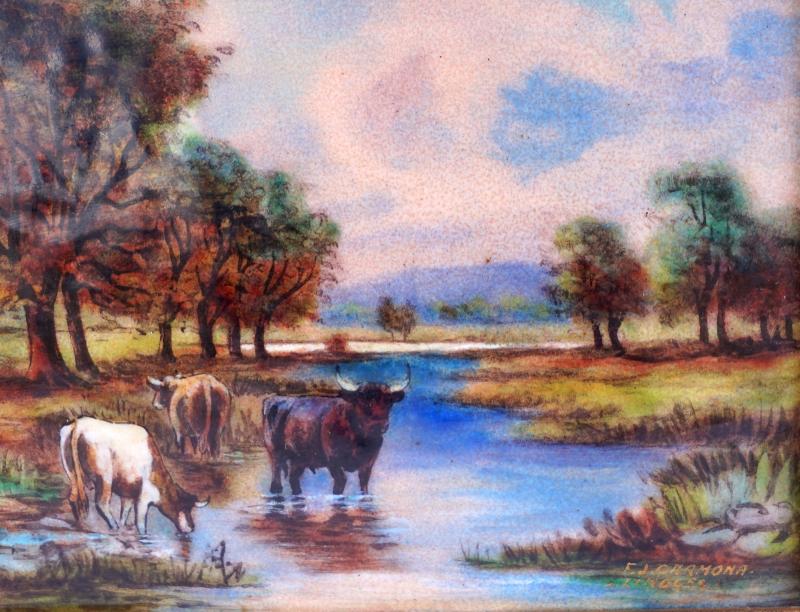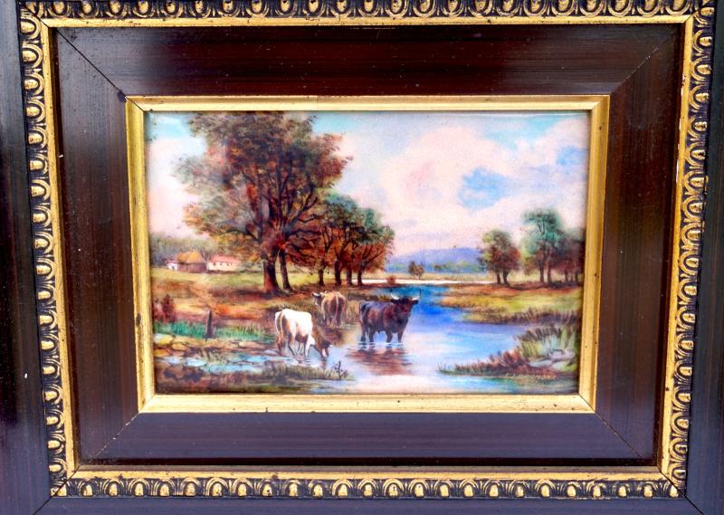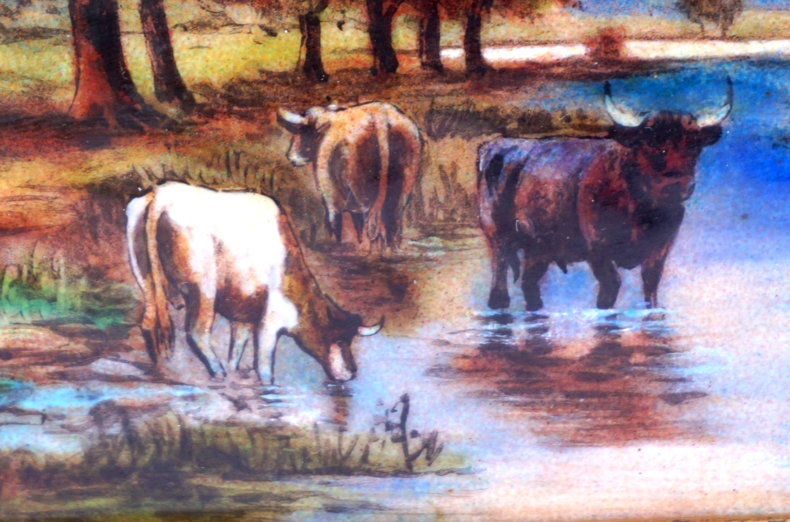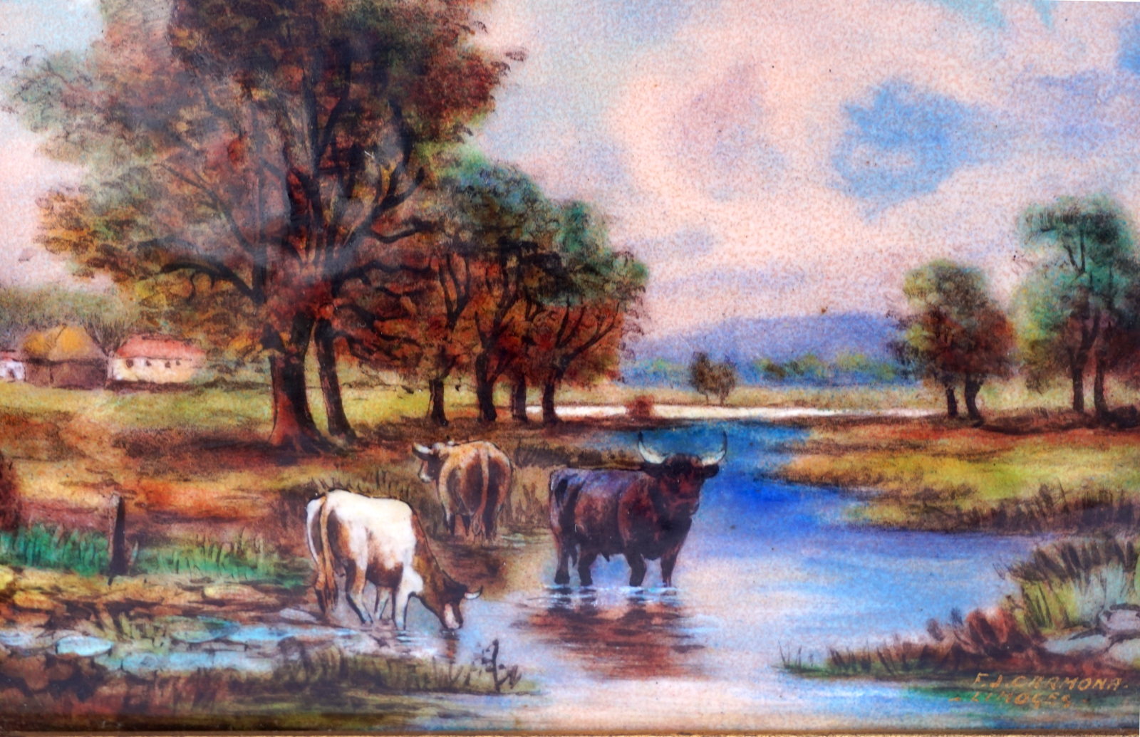 Cows and Bull at the River Enamel Painting Limoges F J Carmona