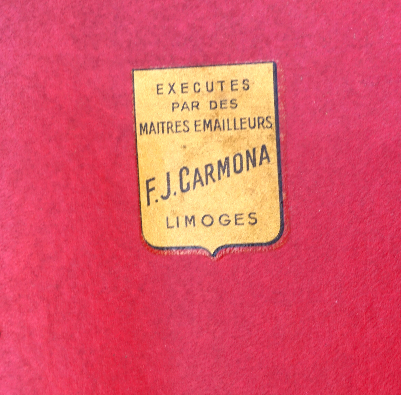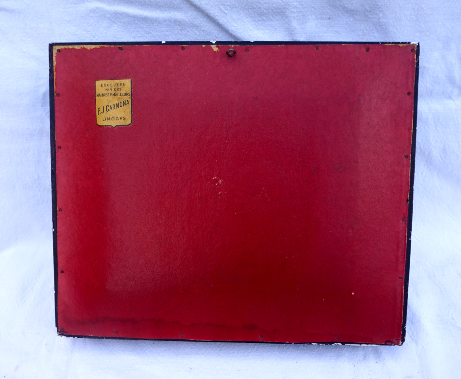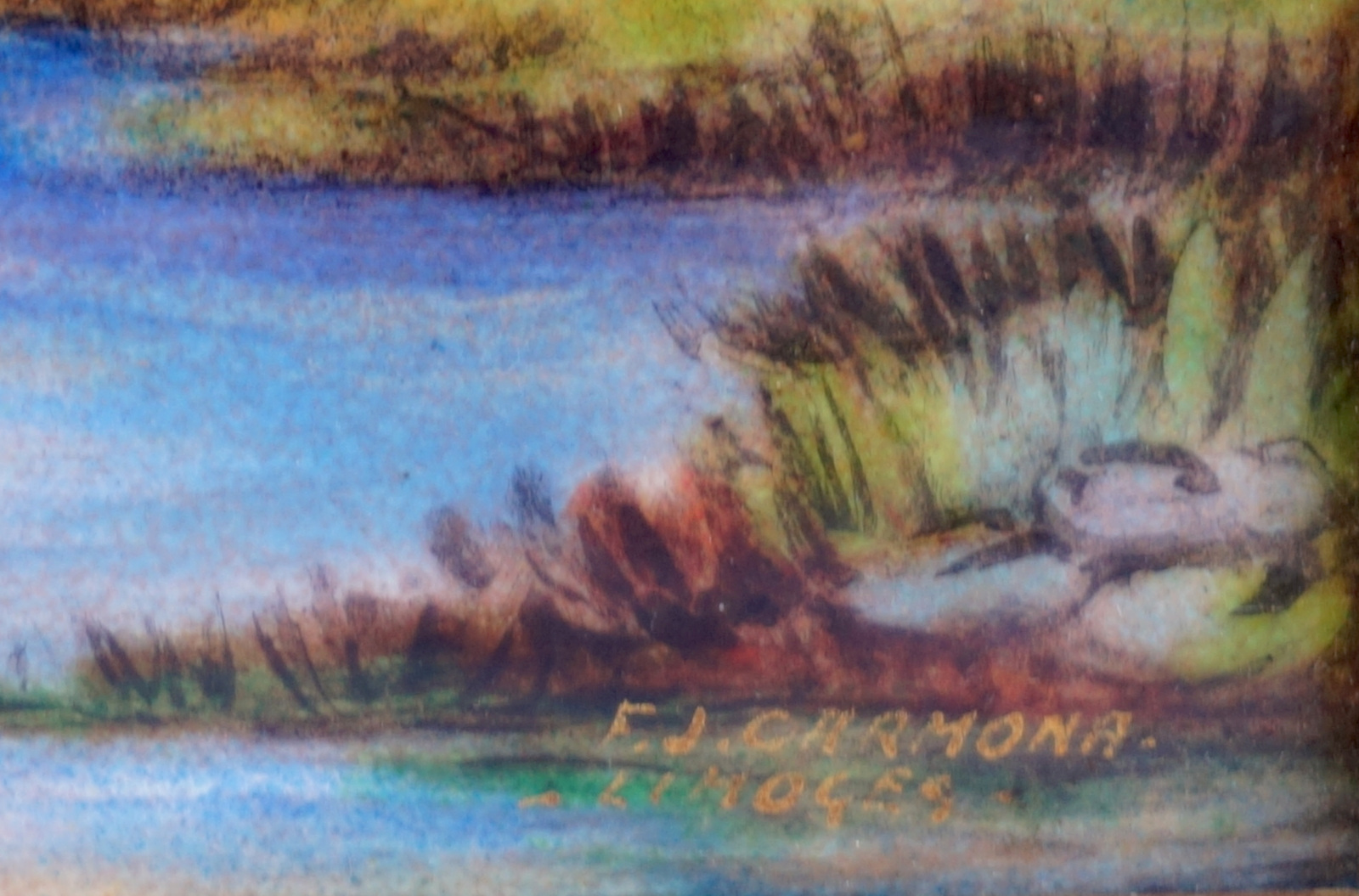 Vaches et Taureau à la rivière, peinture émail sur cuivre par FJ Carmona à Limoges. Signé en base à droite. Dimensions du cadre 31.5 cm par 26.5 cm, pour la plaque de cuivre émaillée 15.2 cm par 10.2 cm. Parfait état.