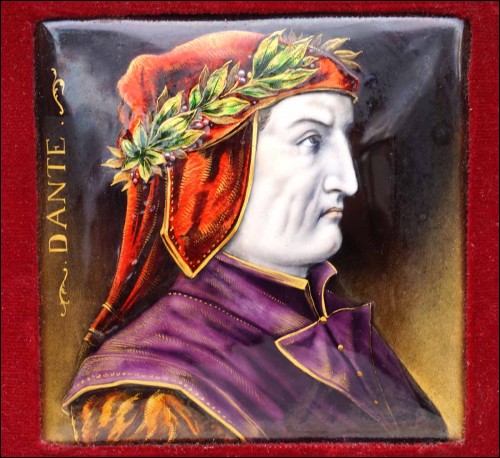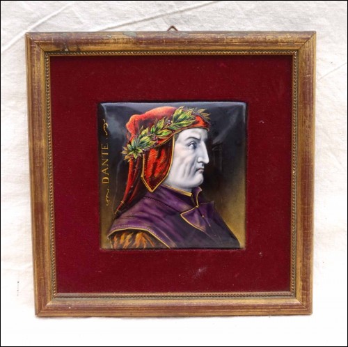 Dante portait, peintuer émail sur plaque de cuivre , fin XIX° siècle. Dimensions; pour le cadre 18.8 cm par coté, pour la plaque 9.8 cm par coté. Très bel état.