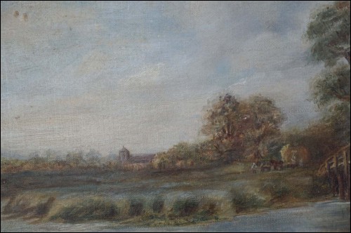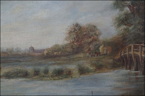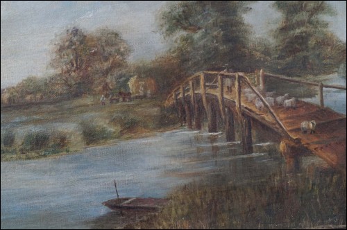 Paysage anglais peint à l'huile sur toile par Henry Harris, vers 1880-90. Au premier plan, un troupeau de mouton passe la rivière avec leur berger sur un petit pont de bois. En deuxième plan, une charrette attelée porte son lourd fardeau de paille, au fond l'église d'un village.