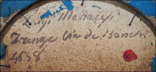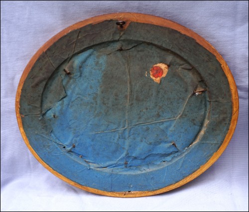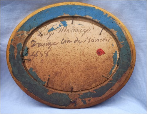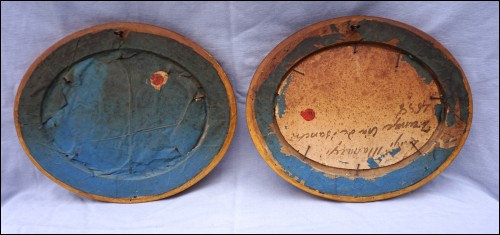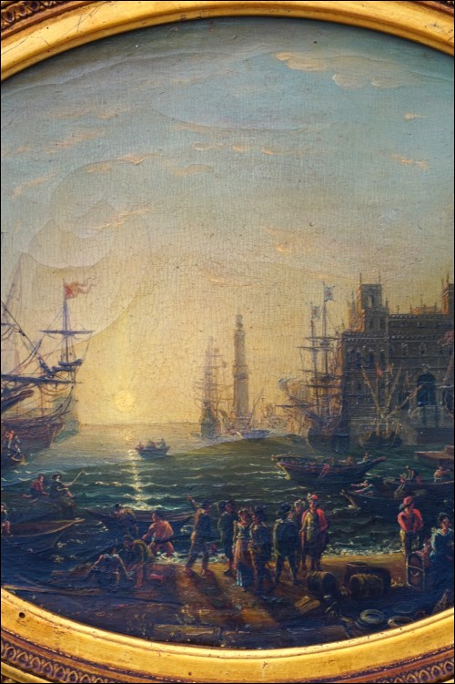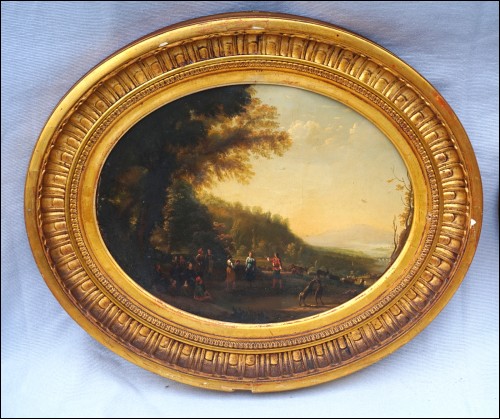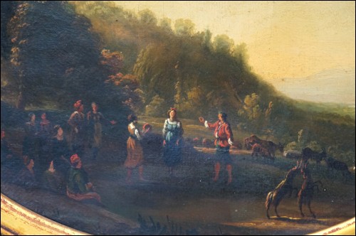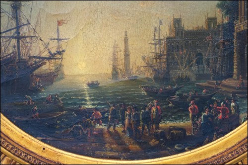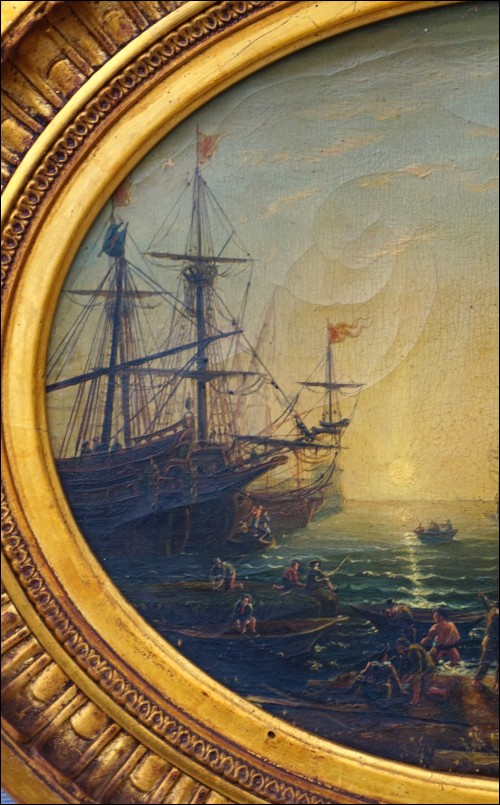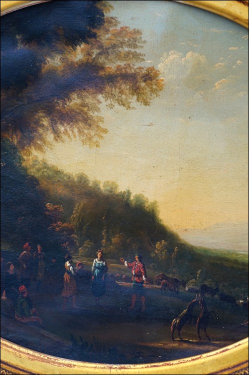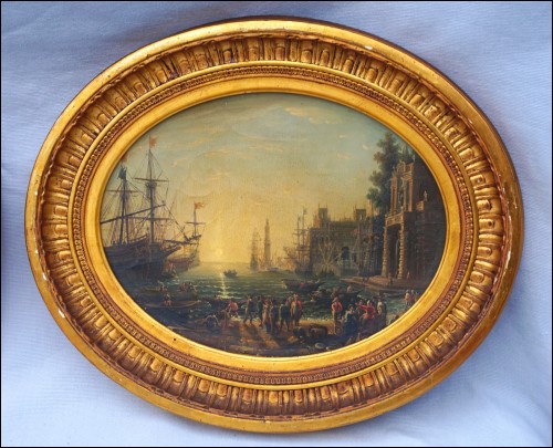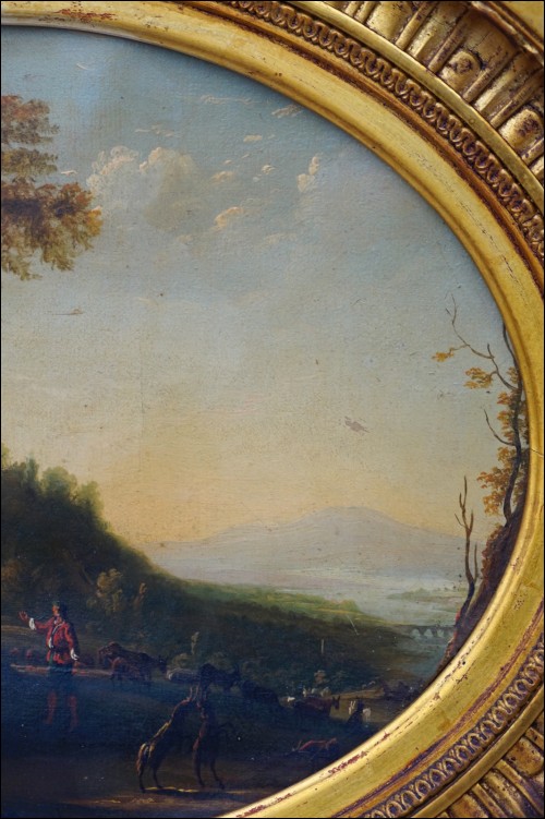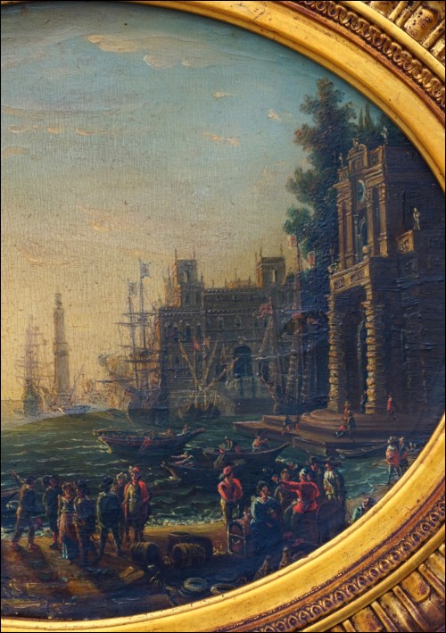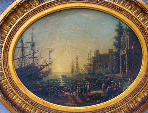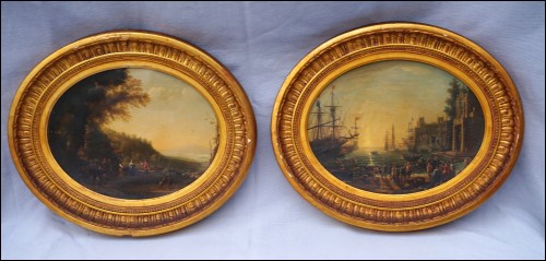 Deux pendants en médaillon peint à l'huile sur toile marouflée (encollée par le bord) sur carton représentant un port au soleil couchant avec la villa Médicis et une fête villageoise romaine, dans le goût de Claude Gellée dit Le Lorrain (Chamagne, v. 1600 - Rome, 23 novembre 1682). Reproductions de la deuxième moitié du XVIIe siècle de tableaux commandés par le Cardinal Carlo de Médicis, conservées à la Villa Medicis. Sans doute peintes à Rome pour un haut dignitaire du Vatican.Les cadres sont en bois sculpté d'époque et doré.Au dos, inscriptions manuscrites et présence de sceaux en cire d'un "Sede Vacante" appartenant au Saint Siège. Dimensions pour les vues: 25 cm x 19.5 cm, pour les cadres 35 cm x 29.5 cm. Très bel état, petits accidents de reparure et trace de patine.