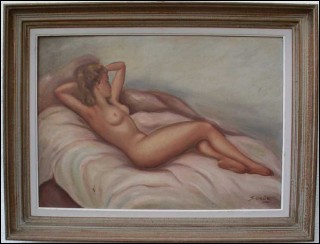Reclining nude oil on canvas with wooden frame paint by Sada artist around 1960. 23⅝" by 31½" with frame. Signed lower right. Good condition.