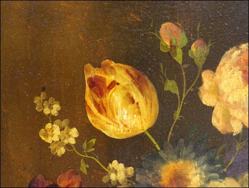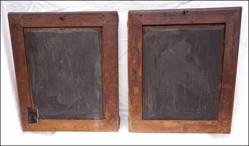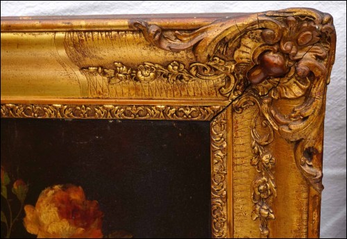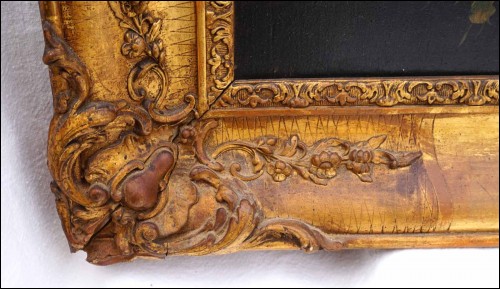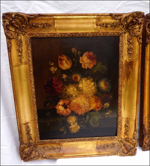 French still life pair of oil painting panel gilt framed made during the second half of the 19th century, Napoleon III period. We don't find signature. They measures for the frames 24 1/4" (61.5cm) by 20 1/2" (52cm) and for the panels 18 1/4" (46.5cm) by 14 1/8" (36cm). Beautiful condition, a small corner of one panel is broken but not missing, they need a good cleaning as shown by the following pictures.