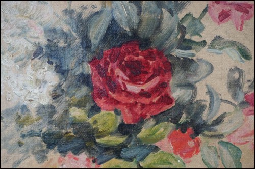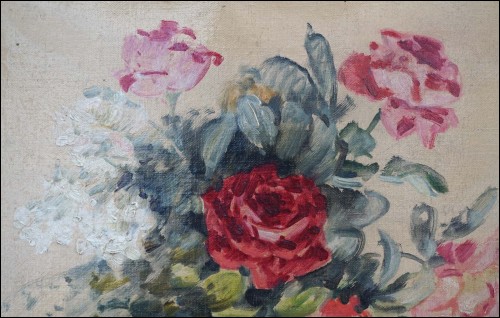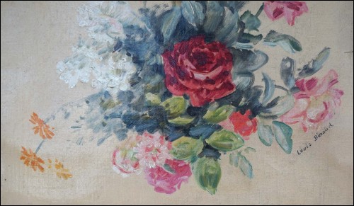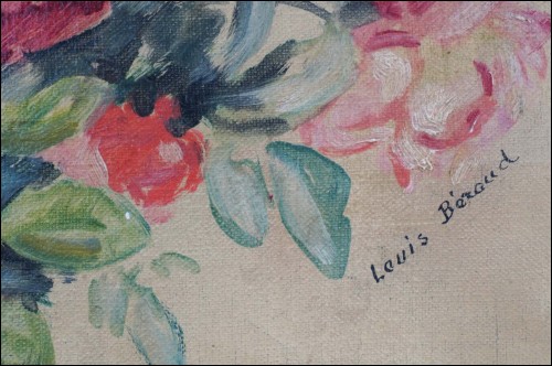 Bouquet de fleurs peint à l'huile sur toile par Louis Béraud, vers 1890, sur châssis. Cette étude pour "la Symphonie en rouge et or" est enlevée et libre, elle rappelle les esquisses que faisait le peintre Delacroix pour ses compositions monumentales. Béraud est un artiste français renommé, il participe aux principaux salons parisiens dès 1873, il sera médaillé de bronze à l'exposition universelle de 1900. Pour la petite histoire, le matin du 22 août 1911 L. Béraud, copiste au Louvre, s'aperçoit le premier de la disparition de Mona Lisa, la "Joconde" de Leonard de Vinci. Hauteur 33cm, largeur 40.5cm.
