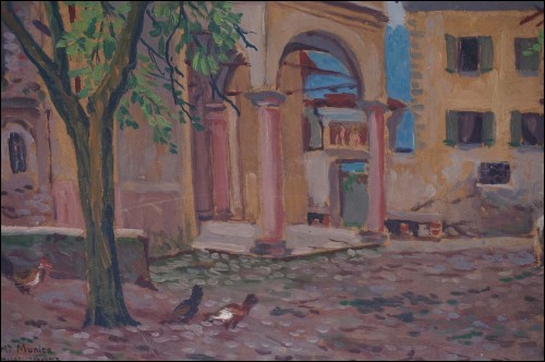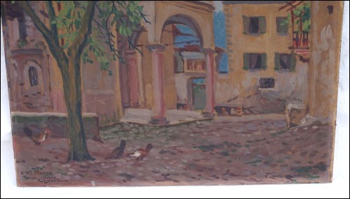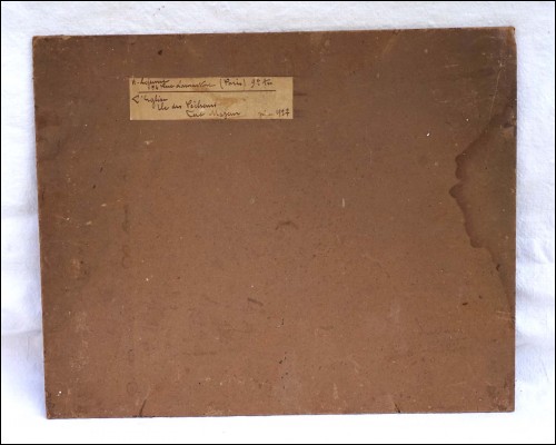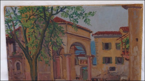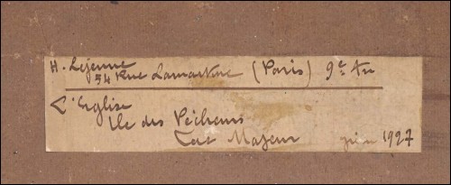 The Church on Isolea dei Pescatori, Lake Maggiore Italy, oil on panel made by Henri Lejeune (1881-1961) in 1927. It's signed and autographed in left corner in front, dated and located on the back. 16 1/8" (41cm) width, 13" (33cm) height. Good condition, the top left corner is slightly folded.