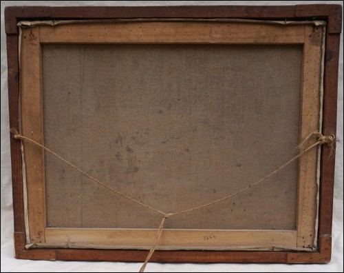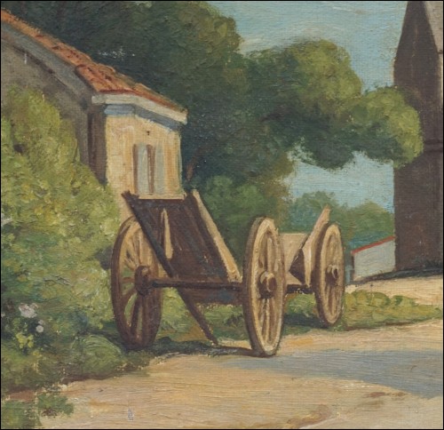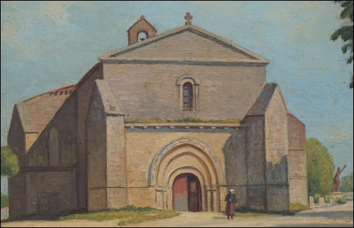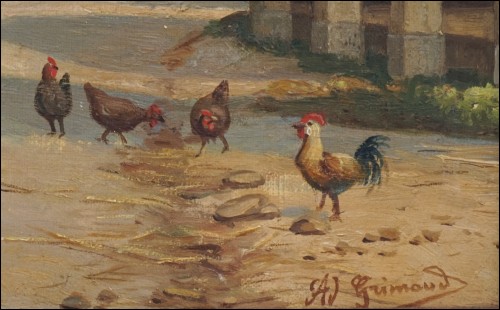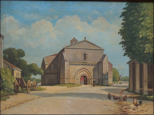 This oil on canvas has been made by Aimé Louis Grimaud artist born in 1925 at Neuilly sur seine, student of the famous Picot artist. The scene show a roman church in the traditional French village with in the foreground one cockerel and hens. It has been painted during the Second World War. 18"tall, 24" length. It's signed on the right bottom. Good condition it has a patina due to it age. This painting will be sold with an appraiser certificate. The wooden frame is in good condition.