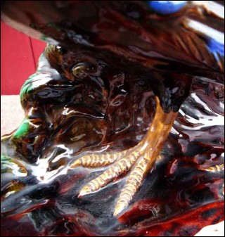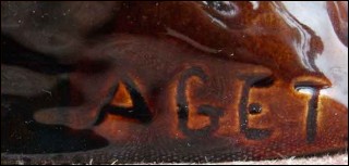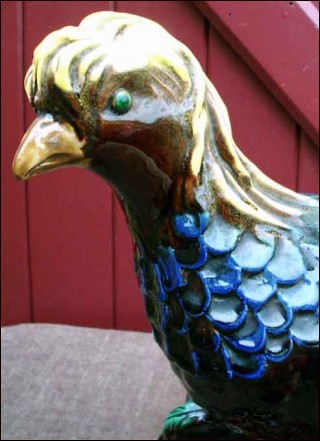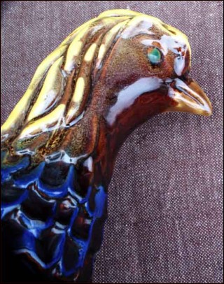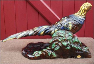 Large golden pheasant in french majolica made by the famous Jaget artist in Tours during the 1940's Art Deco period. It has great color of enamel. Perfect condition, no chips or cracks or hairlines. It's signed in front and on the back it has a label of the dealer. 15" high 25" length 5"5/8 width.