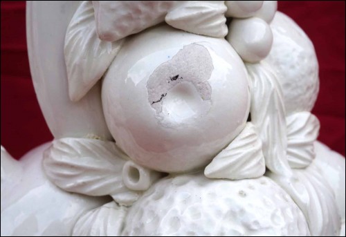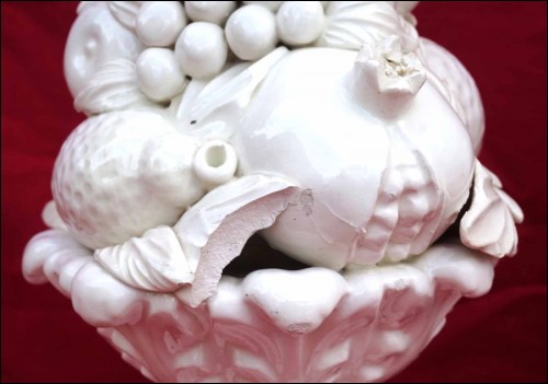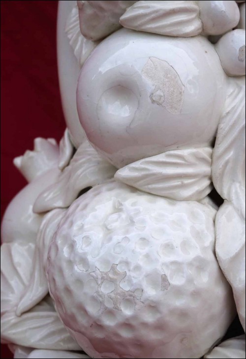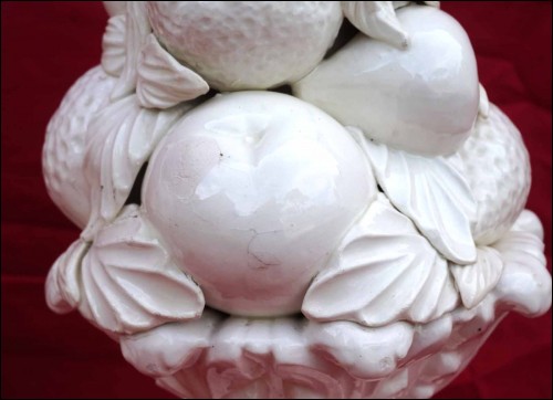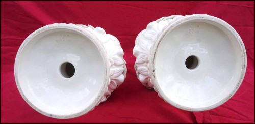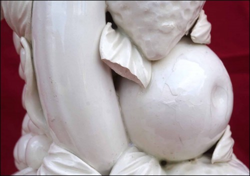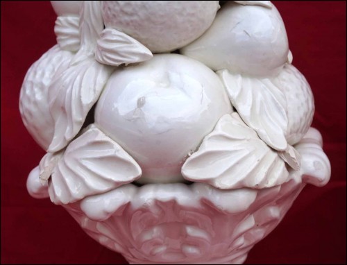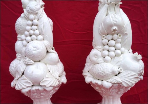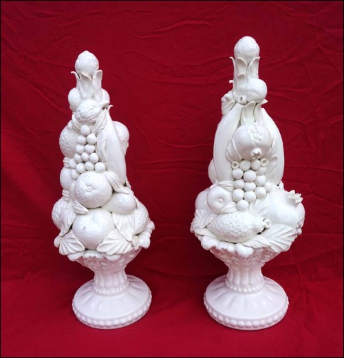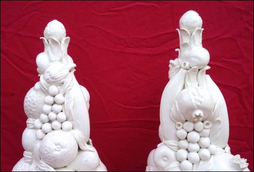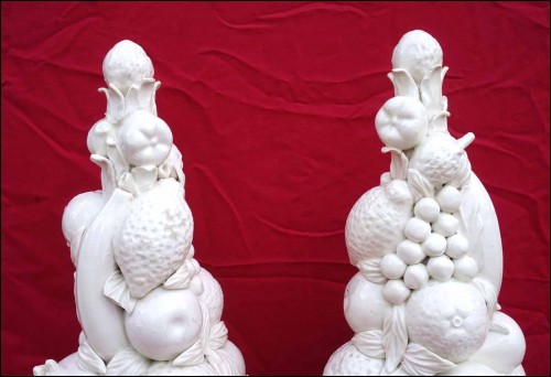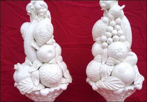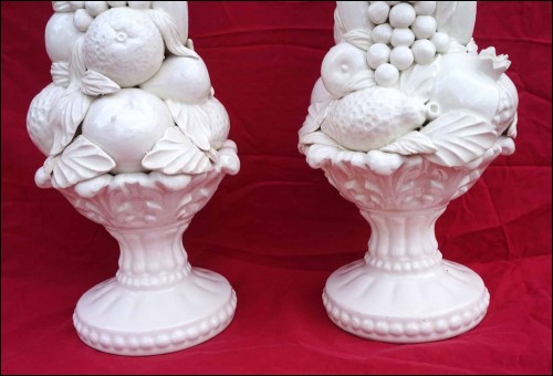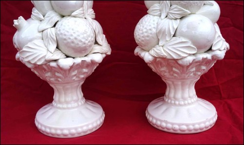 Paire de topiaires en céramique blanche, à décor de fruits et feuillages, Espagne milieu XX° siècle. Hauteur 42 cm, diamètre au corps 17 cm. Quelques manques de glaçure et accidents.