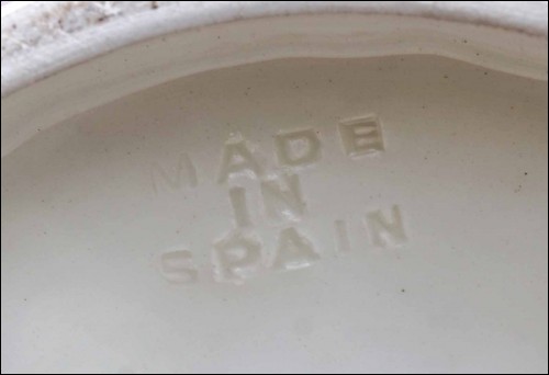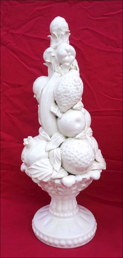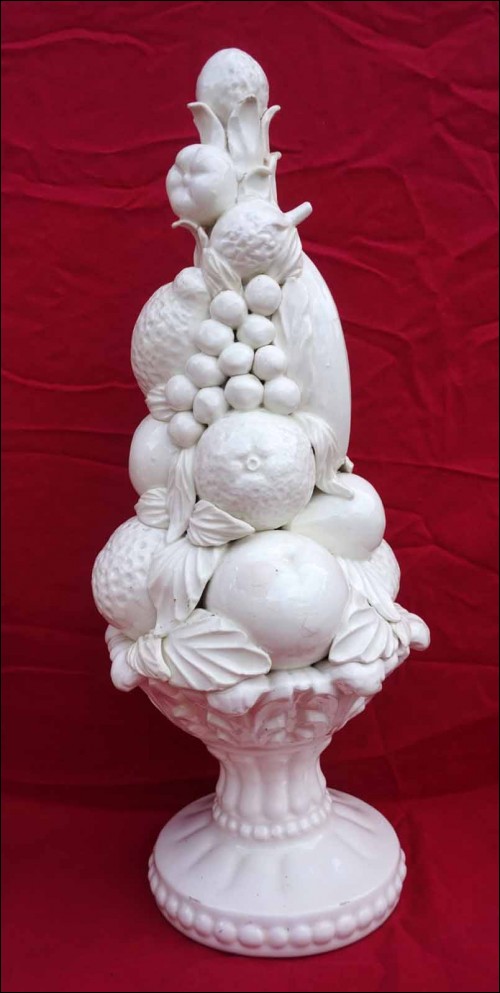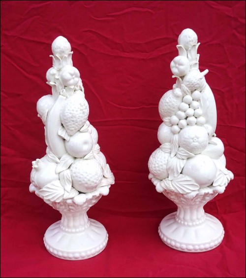 Vintage pair of large topiary, tree fruit basket, in white majolica showing oranges, bananas, grapes and pomegrantes made in Spain during the mid-century. They are stamped on the bottom Made in Spain. 16 1/2" (42cm) height, 6 3/8" (17cm) diameter. A few small chips and glaze shortages as shown by the following pictures.