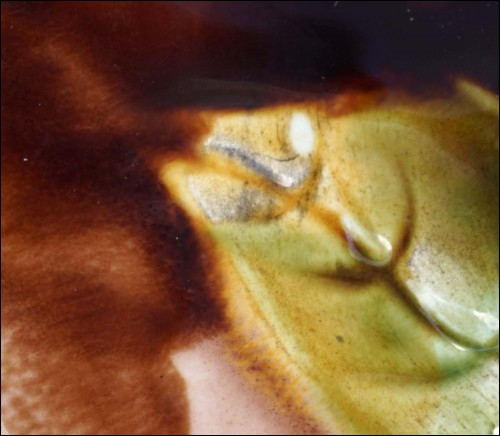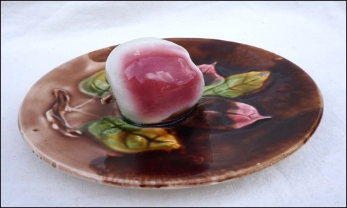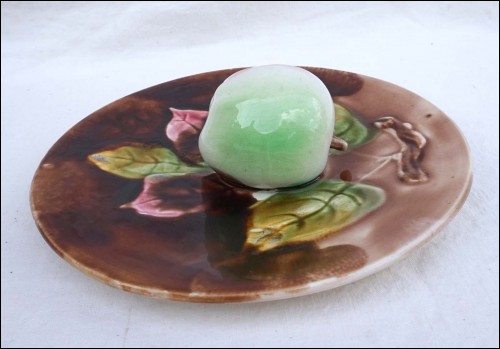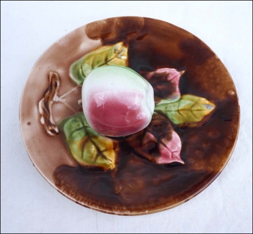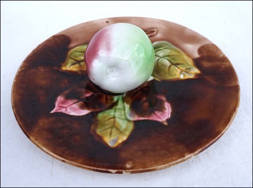 Assiette trompe l'oeil à la pomme ,en barbotine de Orchies Moulin aux Loups à Harmage, vers 1900. Diamètre 20.5cm, hauteur 6cm. Bon état, petits manques d'émaillage.