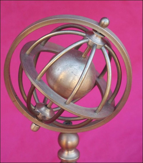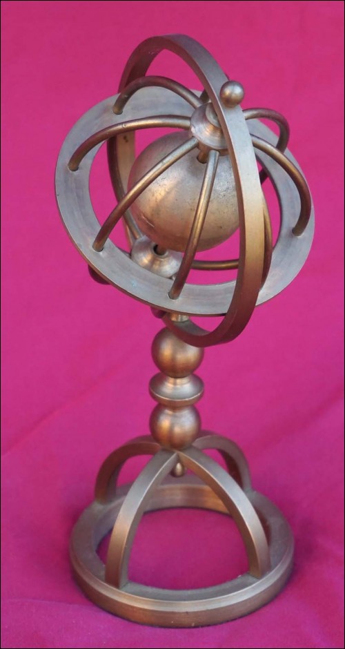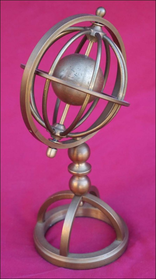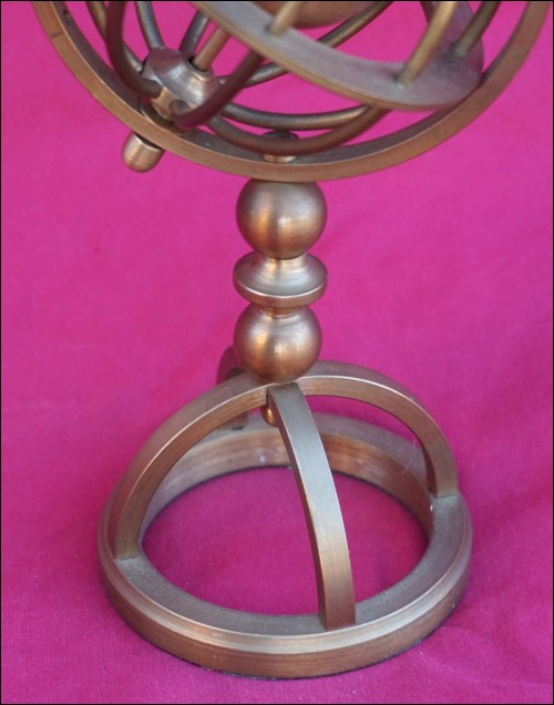 Armillary sphere miniature hand crafted brass with brass ball made during the mid-century. 6 5/8" (17 cm) height, 33/84" (9.5cm) diameter. Good condition as shown by the following pictures.