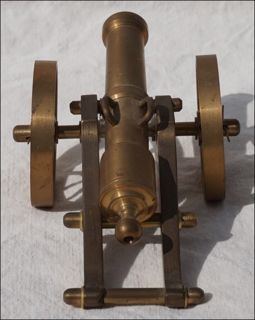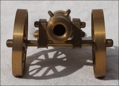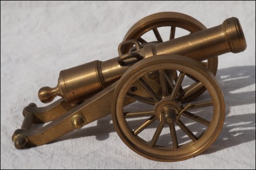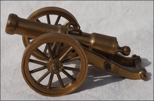Presse-papier de bureau canon en laiton de style Empire. Miniature artisanale vintage. Bon état. Longueur 15,5 cm, largeur 10 cm, hauteur 7 cm.