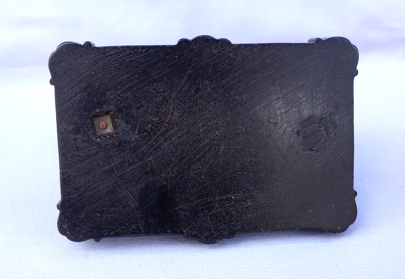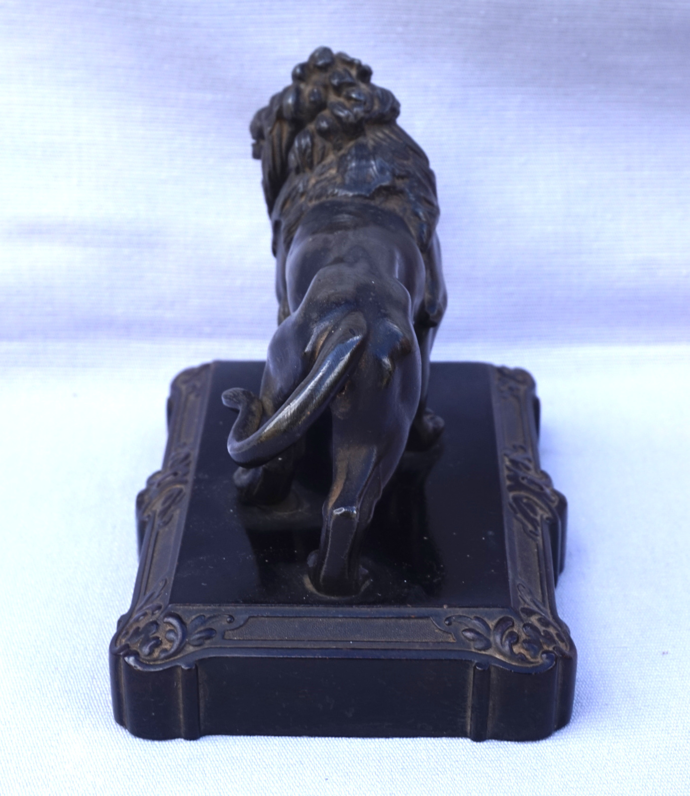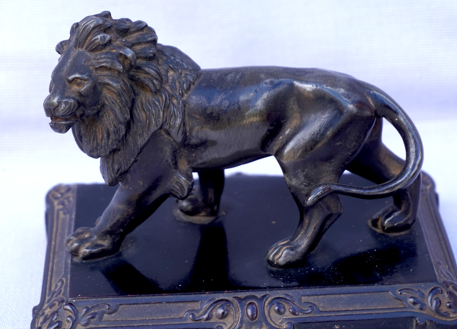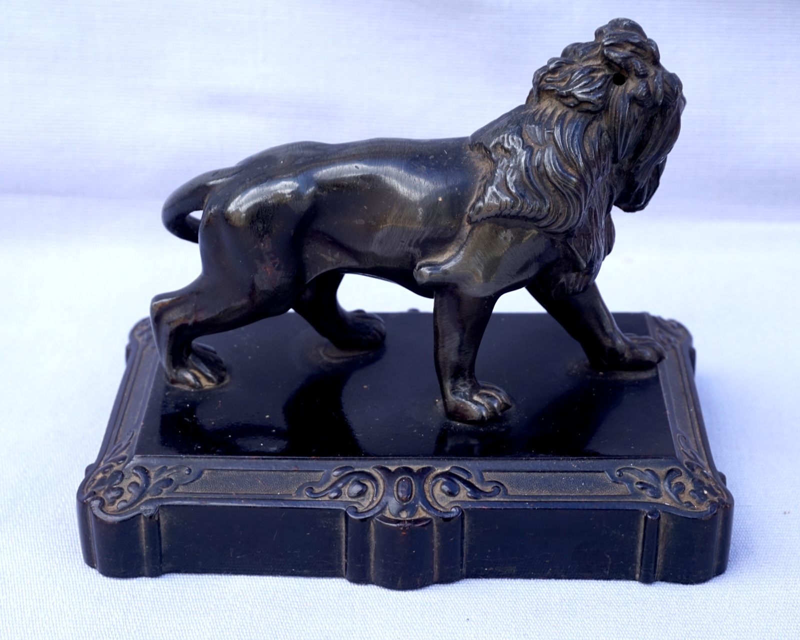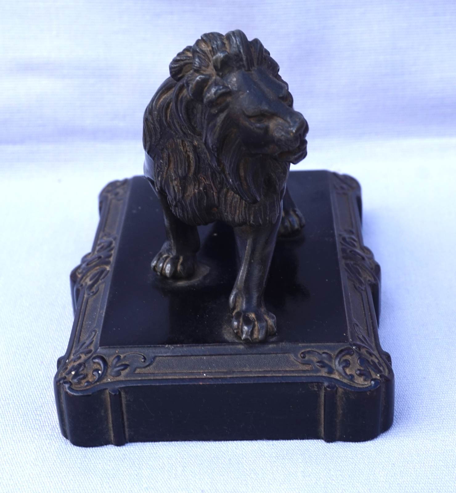 Lion débout sculpture presse papier en métal patiné noir sur un socle en bakélite . Longueur 14.2 cm, largeur 9.5 cm, hauteur 11 cm. Très bel état.