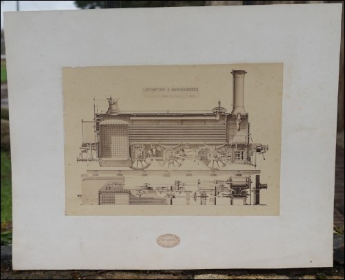 French steam merchandise locomotive plan made by A Keochlin and G Schivre in Mulhouse, photographic picture G Dardel middle of the 19th century. Dimensions of the photo 10 5/8" width 7 1/2" height, 14 1/2" by 11 5/8" overall.Provenance: collection of Francois Prosper Jacqmin (1820-1889), Student of the Ecole Polytechnique,engineer of Imperial school of Ponts et Chaussées, teacher and chairman in this school, member of the Jury, class 52, of the Paris Universal Exhibition in 1867. Good condition as presented on the following pictures.